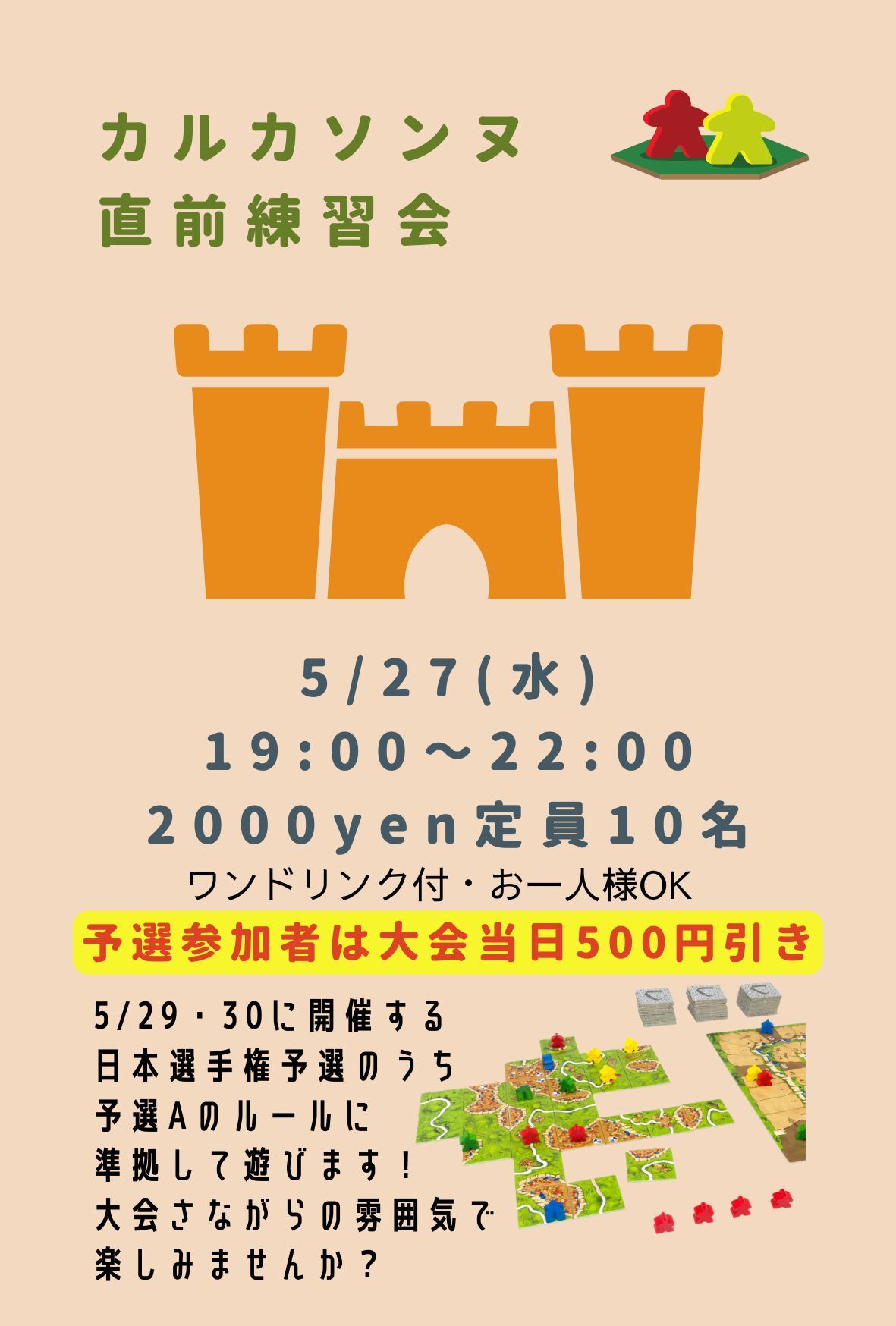 | 詳細内容 | タイルをつなげ発展していく道や都市、草原などに「ミープル」という駒を置き得点を獲得していく『カルカソンヌ』を楽しめるイベントです! 今年もカルカソンヌ日本選手権予選を5/29(金)に予選A、5/30(土)に予選Bの2日間分け開催予定! こちらのイベントは5/29(金)の予選Aのルールに則り貸切開催! 大会練習したい人!当日参加できないが雰囲気を味わいたい人! いつもと少し違う形でカルカソンヌを遊んでみませんか? 🕍カルカソンヌ直前練習会 ※ボドゲーマからの予約は受け付けておりません。参加希望者は上記の申し込み方法から必ずお申し込み下さい。