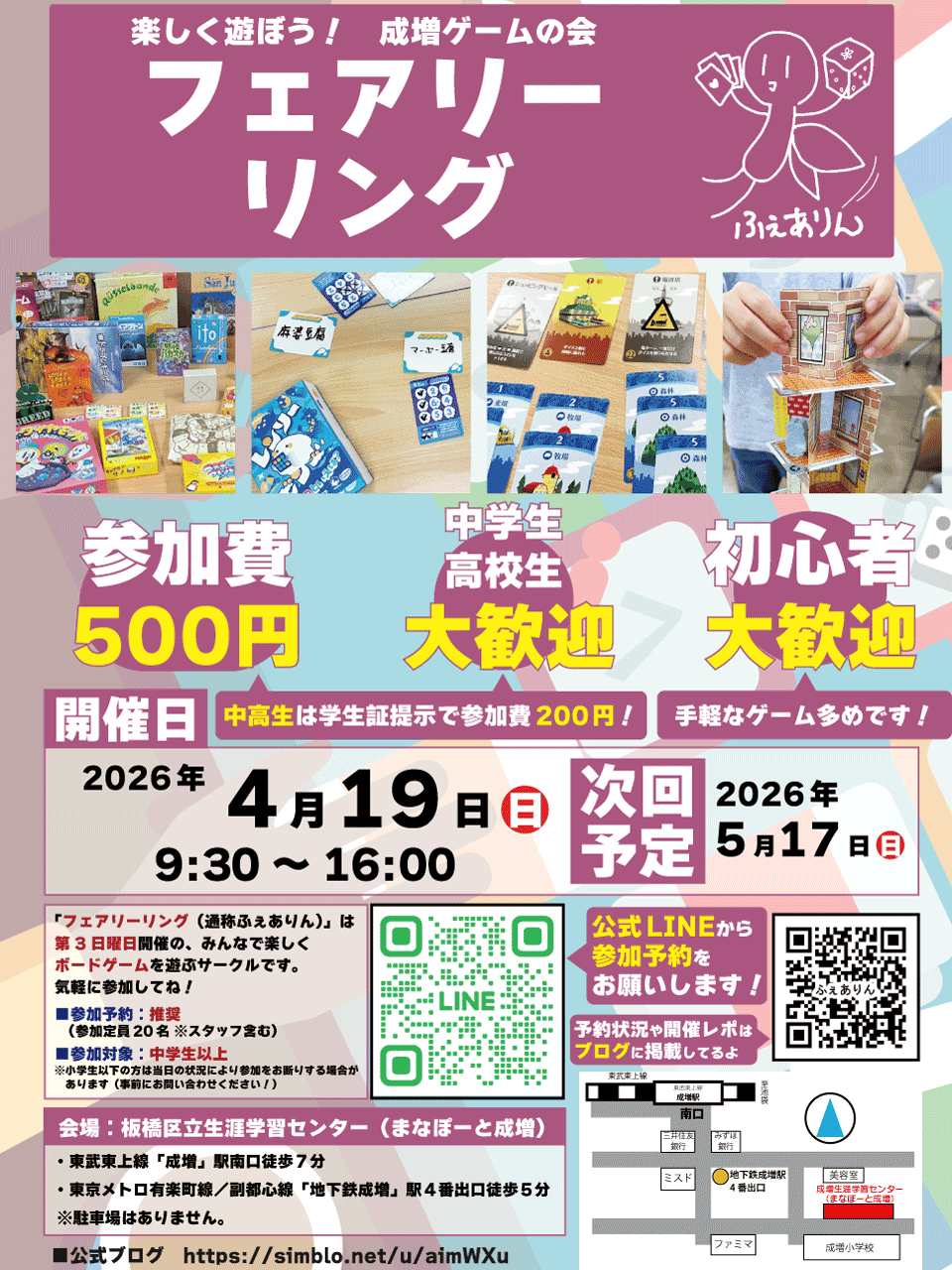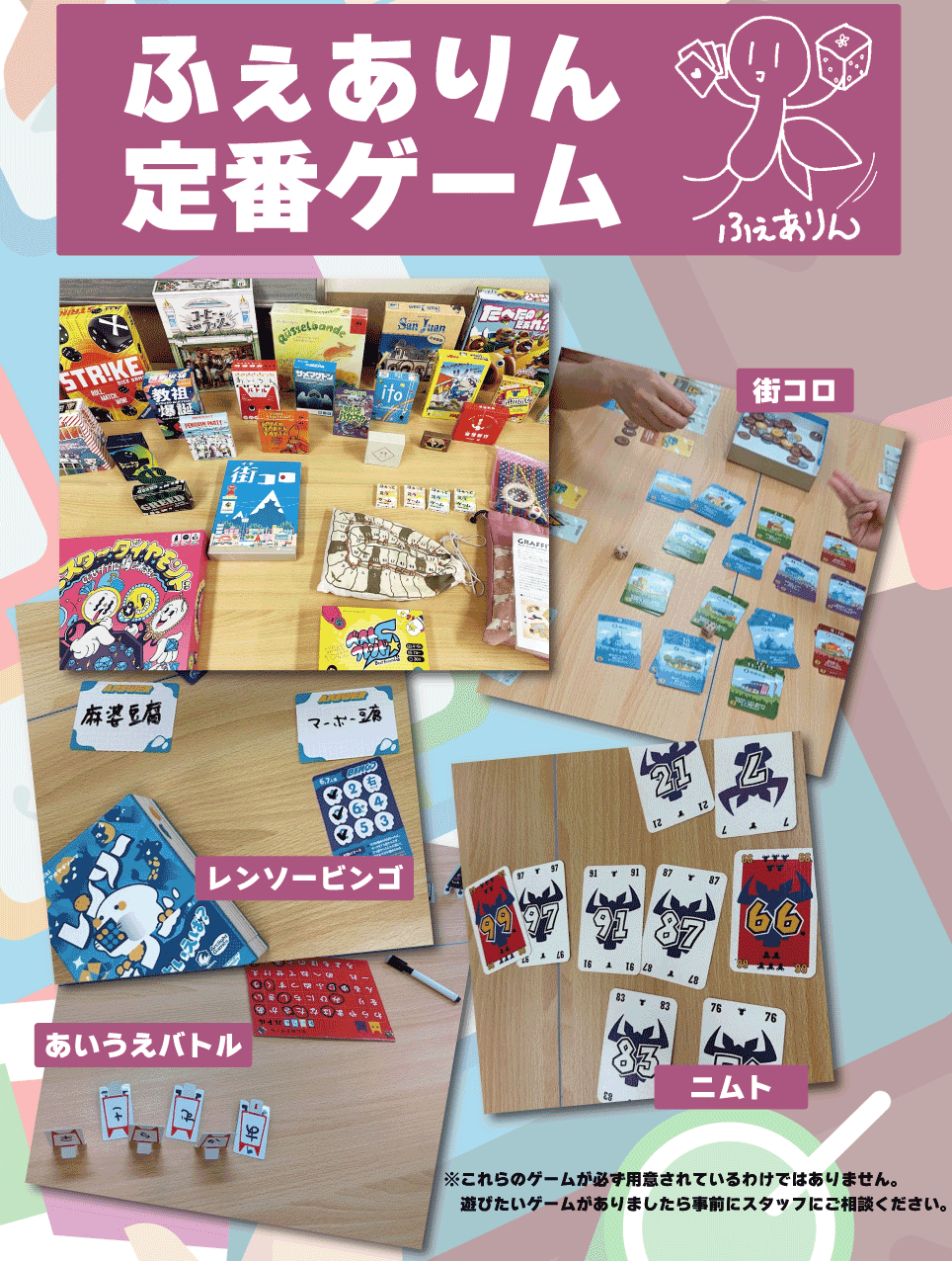 ★「事前の参加予約はしなかったけど、当日に時間が空いたので参加したい!」という場合も、事前にLINE公式アカウント「ボドゲのふぇありん公式」 までご連絡ください。当日の参加状況を見て、参加の可否のご連絡をいたします。ただし、イベント当日はスタッフがイベント運営を行っているため、すぐにお返事できない場合があります。あらかじめご了承ください。