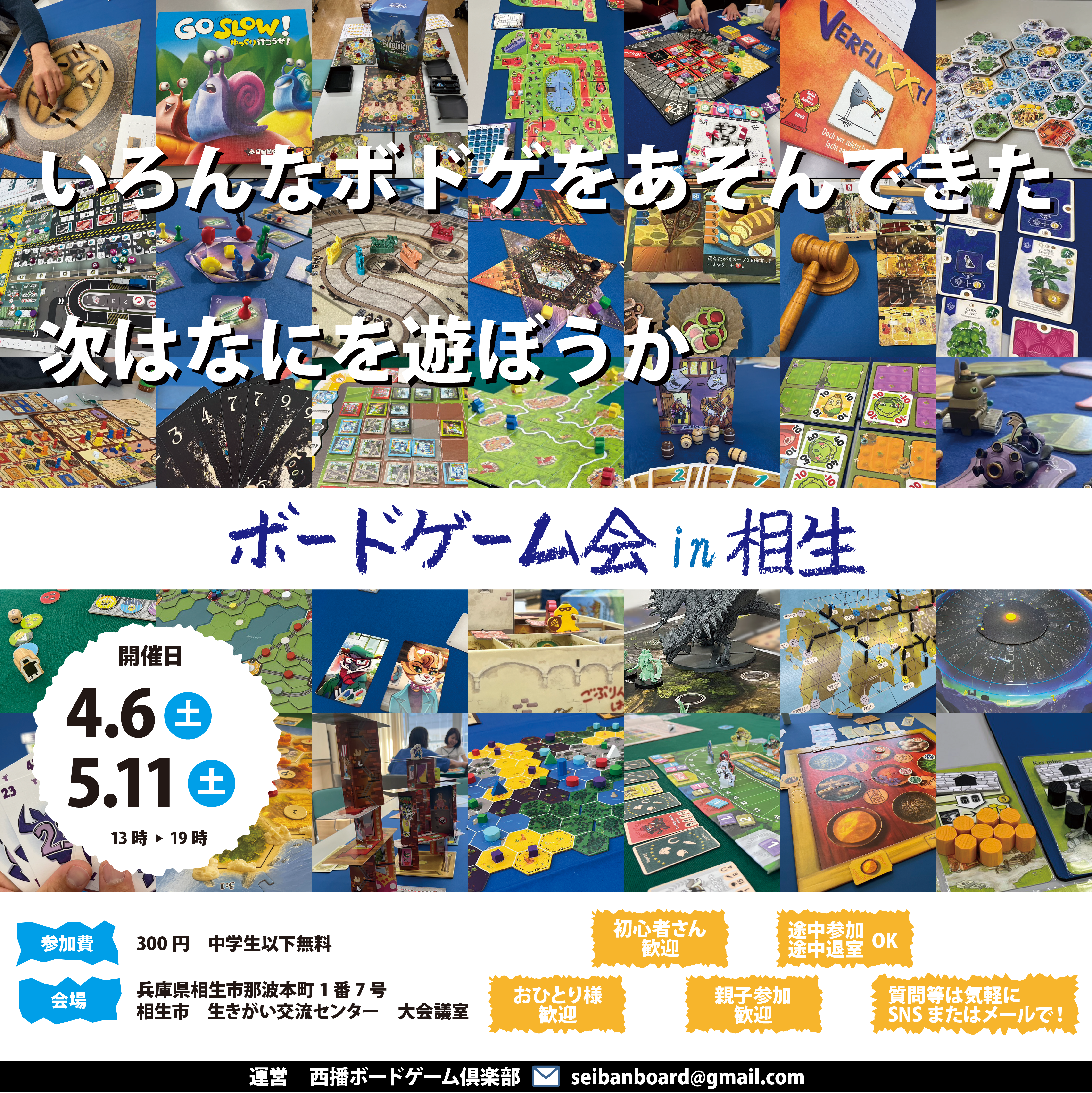 | 詳細内容 | 4月6日(土) 13:00-19:00 相生市生きがい交流センター大会議室にて ボードゲーム会を行います 初心者・おひとり様・学生・シニア 皆さん歓迎です。 幅広い年代の方々が楽しまれています。 見学のみでもかまいません。 まずは足を運んでみてください。 よろしくお願いいたします。