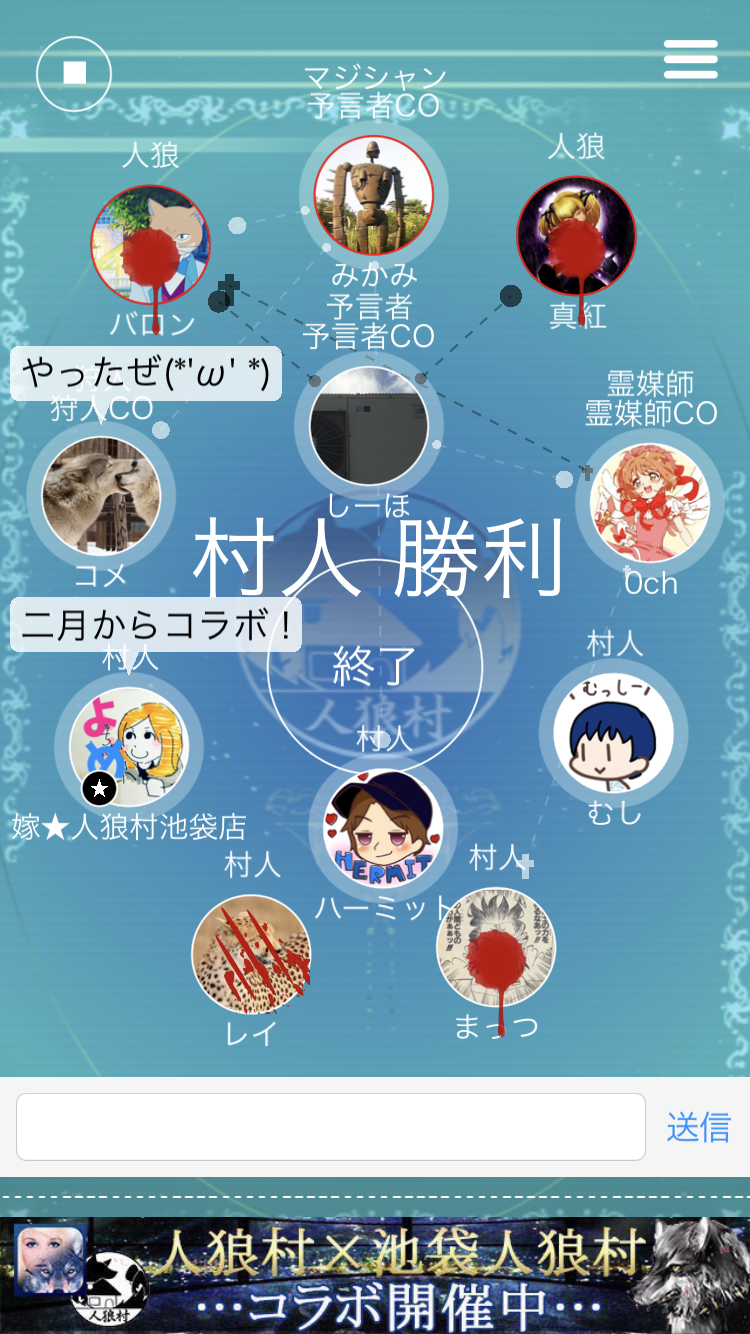 | 詳細内容 | アプリ人狼村と池袋人狼村がコラボレーション!!! 全国どこにいても気軽に人狼ゲームが楽しめるアプリです♪ 池袋人狼村のオリジナル役職もイベント村限定でリリース予定! 人狼村スタッフと一緒に、人狼ゲームを遊びましょう♪(*´∀`*) 【期間】 2月1日〜2月末まで(予定) イベント村限定の背景や、カード画像も乞うご期待! ↑こちら、アプリ公式になります。 ※iPhone限定アプリです。 |