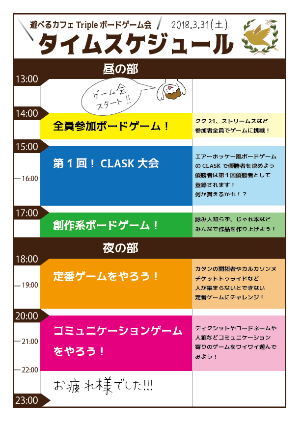 | 詳細内容 | 遊べるカフェTripleでボードゲームを遊ぼう! ・遊べるカフェTripleが好きな方 ・みんなでワイワイ楽しみたい方 ・ゲームで功績を残したい方 月に1度行われるTripleボードゲーム会です 初めての方も、通い慣れた方も、誰もが楽しめるイベントです! 【日時】3/31(土) 13:00 - 23:00 【参加費】通常料金 【定員】24名 【内容】ゲーム大会や大人数で遊べるゲームをワイワイ楽しむ会 ※当日は通常営業は行いませんのでご注意ください 【タイムスケジュール】 13:00 遊べるカフェTripleボードゲーム会スタート!! 14:00 全員参加ボードゲーム! 参加者全員でボードゲームを遊びます 普段なかなか遊べないゲームもたくさん 参加者同士の輪も広がります 15:00 CLASK大会! エアーホッケー系ボードゲームのCLASK大会! 大人がアクションゲームを本気で遊んでもらいます 優勝するといいことあるかも!? 17:00 創作系ボードゲーム! 文字を書いたり絵を書いたり 物語や作品を作ったり 発想と勢いが大事、盛り上がること間違い無し! 18:00 定番ゲームをやろう! 「カタンの開拓者」や「カルカソンヌ」「ドミニオン」など やってみたいけど機会がないことが多いですね ルールはもちろん丁寧に説明するので初めてでも安心です 20:00 コミュニケーションゲーム 「Dixit」や「コードネーム」や人狼系ゲームなど 参加者で話しながら楽しむゲームを遊びます 自分にあったジャンルのゲームに参加してみてくださいね 23:00 イベント終了!お疲れ様でした! |