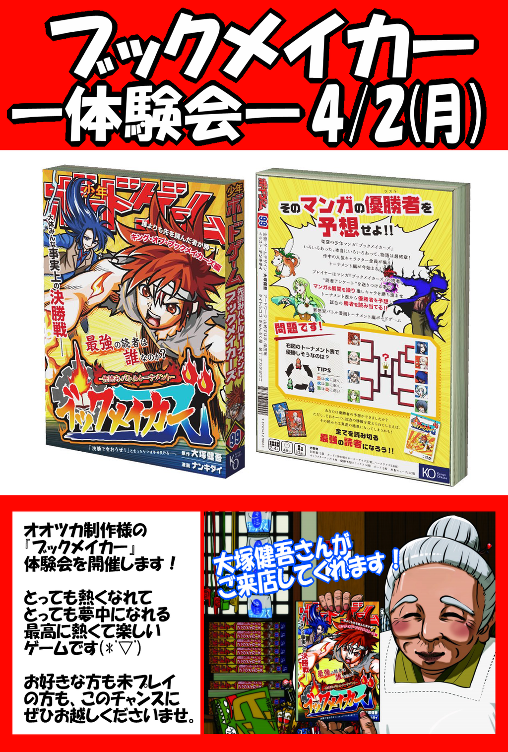 | 詳細内容 | ゲムマ大阪前でみなさん盛り上がってるころではないでしょうか? ですが ゲムマ後もまだまだ盛り上がっていきましょう! 「理想の納豆」「行けたら行くよ!」「ギリギリカレー」 などを作っておられる、「オオツカ制作」様の大塚健吾さんがギルドにご来店していただけると言う事で… 【ブックメイカー】の体験会を開催いたします。 http://bookmakers.sakura.ne.jp/ 男女問わず熱くなれるとっても最高のゲームです( *´艸`) 開催日時:4月2日(月曜日) 第一部:15:00~ 第二部:17:00~ 第三部:19:00~ 各回定員4人・当日参加も可能ですがご予約で埋まった場合はご予約優先となります。 ! ですがプレイ時間や人数に余裕があればずれても参加可能ですので、ご来店やお問い合わせ、ご予約お待ちしております ご予約・お問い合わせは、 お電話(06-6926-4833)または、 Twitter(@bgshop_guild)までお気軽にどうぞ! 今回もみなさまのご参加楽しみにお待ちしております(*ノωノ) |