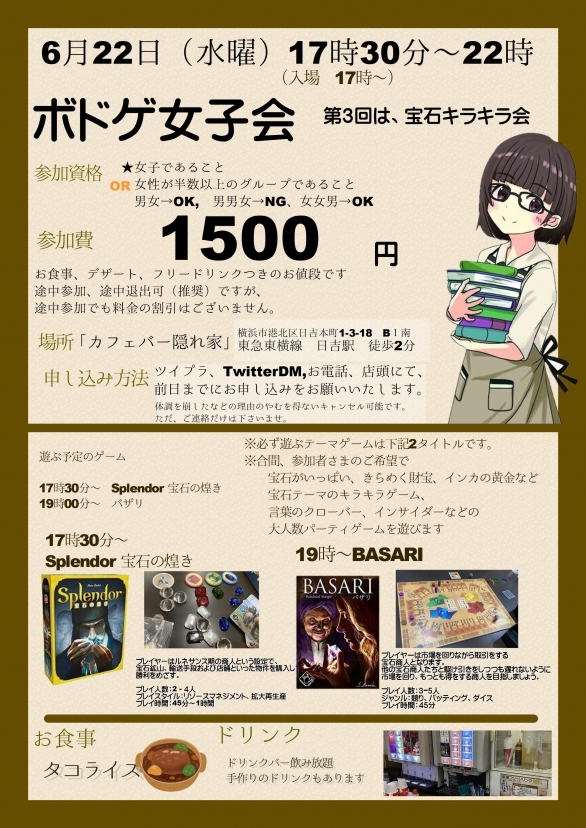 | 詳細内容 | はじめまして。ボドゲカフェ店員の春川です。 普段お店では重ゲーが遊ばれがちなので、軽くてかわいいコンポーネントのゲームを中心に遊びたいと思い、ボドゲ女子会を立ち上げました。 「女性限定」ではなく「女性中心」と思ってますので、男性単独の参加はお断りしております。男女カップルの参加は大丈夫です。 店員企画の会という事で、正規の料金より安くして貰ってます。参加者が多いとシリーズ化できるので、ぜひご参加お願いいたします。 最大5時間 お食事、デザート付き 1500円 お食事:タコライス デザート:宝石の煌きモチーフの琥珀糖 (の予定) ・・・・・・・・・・・・・・ 17時半~ Splendor 宝石のきらめき 19時~ BAZARI バザリ ・・・・・・・・・・・・・・ こちら、もしくはツイプラから、お申込みお願い致します。 https://twipla.jp/events/517137
