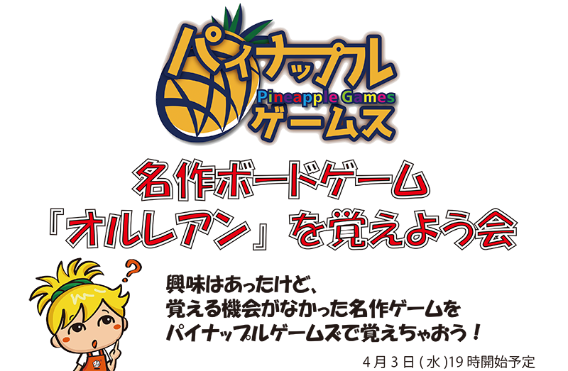 | 詳細内容 | イベント概要 日本では入手困難の「オルレアン」のルール解説と、実際にプレイに参加いただけます。 パイナップルゲームズは、全国的にも珍しい、フード&ドリンクのお持ち込みがOKの店舗になります! 是非この機会に、当店をお試しください! 店舗ホームページ https://www.pineapple7games.com |