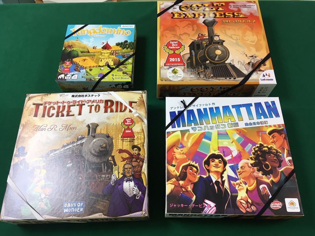 だんだん、棚がいっぱいになりつつあるのでまた近々置き方を考えないといけないかもしれません(嬉しい悲鳴) 前回はエキスパート部門が好評で無事に終わりました。参加者の皆様本当にありがとうございました。 今回は、年間大賞を遊んでいきたいと考えております。 第一回目 ドイツ年間大賞を遊ぼう ゲーム紹介 1、キングドミノ 2、コルトエクスプレス 3、チケット・トゥ・ライド・アメリカ 4、マンハッタン 5、??????? 本来、第一回目は不朽の名作、「カタン」、「カルカソンヌ」、「ブラフ」、「ドミニオン」をやっていくべきなのでしょうがそれらはまた次の機会にまわしていきたいとおもいます。 5番の作品につきまして 5番は、ボドパやにあるドイツ年間大賞の作品をきていただける皆様にツイプラでコメントで選んでいただきその一作品を遊んでいこうとおもいます。 当店においてある大賞部門のボードゲーム 1980年大賞:ラミィキューブ 1983年大賞:スコットランドヤード 1993年大賞:ブラフ 1995年大賞:カタン 2000年大賞:トーレス 2001年大賞:カルカソンヌ 2003年大賞:アルハンブラ 2009年大賞:ドミニオン 2010年大賞:ディクシット 2013年大賞:花火 2014年大賞:キャメルアップ 2016年大賞:コードネーム 2018年大賞:アズール まだまだ数が少ないですが、この中からお選び頂きツイプラのコメントまでよろしくお願い致します。 まだやったことのないゲームがあり興味があるかた、ボードゲームをやり始めたばかりの方、久々に赤ポーンを遊んでみようとおもう方のご参加お待ちしております。 ツイプラ、OSGのお問い合わせフォーム、電話にてのご連絡にて皆様のご参加希望を募集します。 ツイプラからのご参加はこちらからよろしくお願い致します→ ツイプラ