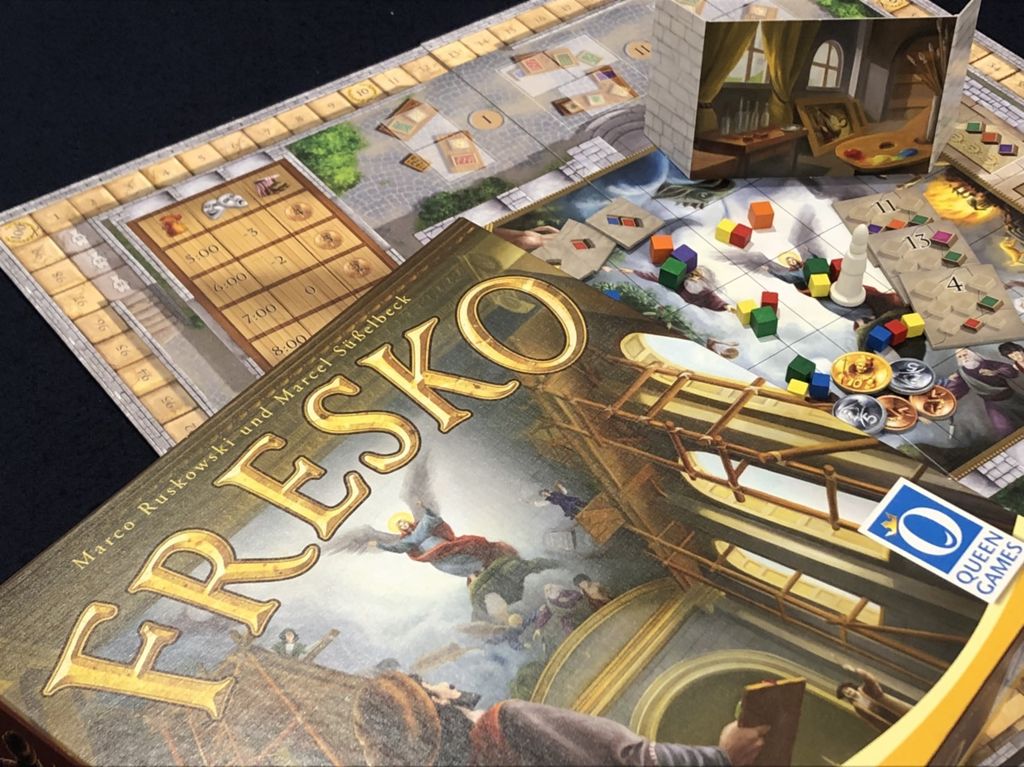 | 詳細内容 | プレイ時間が長いゲームを遊ぼう!というこの企画。今回遊んで頂くのはコチラ! 4月30日(火)に遊ぶ予定のゲーム 『フレスコ』 大聖堂の天井画である『フレスコ画』を修復するのが目的のゲーム。そう、職人たちの朝は早い。 起床時間から購入する絵の具など、職人たちにこまかく指示していき修復を一番に進めていったプレイヤーが勝利を掴む。 修復を進めると天井画が見えてくるのもワクワクポイント。重ゲージャンルながらも比較的分かりやすいライトユーザー向けの今作は『重ゲーを始めてみたいっ!』という方にうってつけと言えるだろう。 ※予想プレイ時間:60~90分 イベント概要