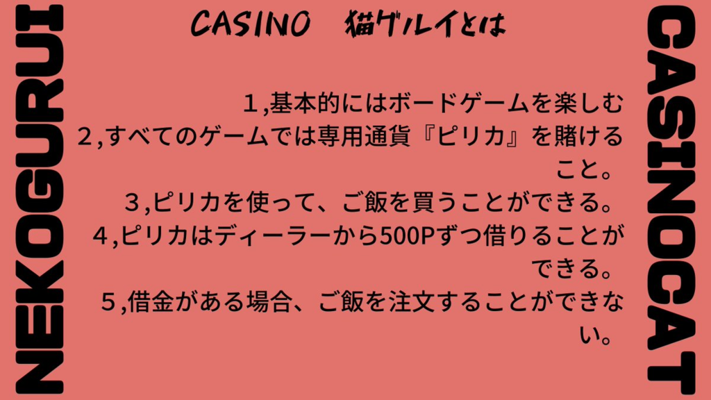 | 詳細内容 | 圧倒的閃き!さぁ!ギャンブルを始めよう!そして手に入れろ!絶対的な!悪魔的な!金(ピリカ)を!! 当イベントは、カジノ風ボードゲームイベントです。参加費の支払い時、お客様には擬似通貨「ピリカ」を配布します。お客様にはピリカをbetして、自由にボードゲームを行ってもらいます。稼いだピリカで限定フードメニューを手に入れましょう。 さあ!!最高にネコグルイましょう!!