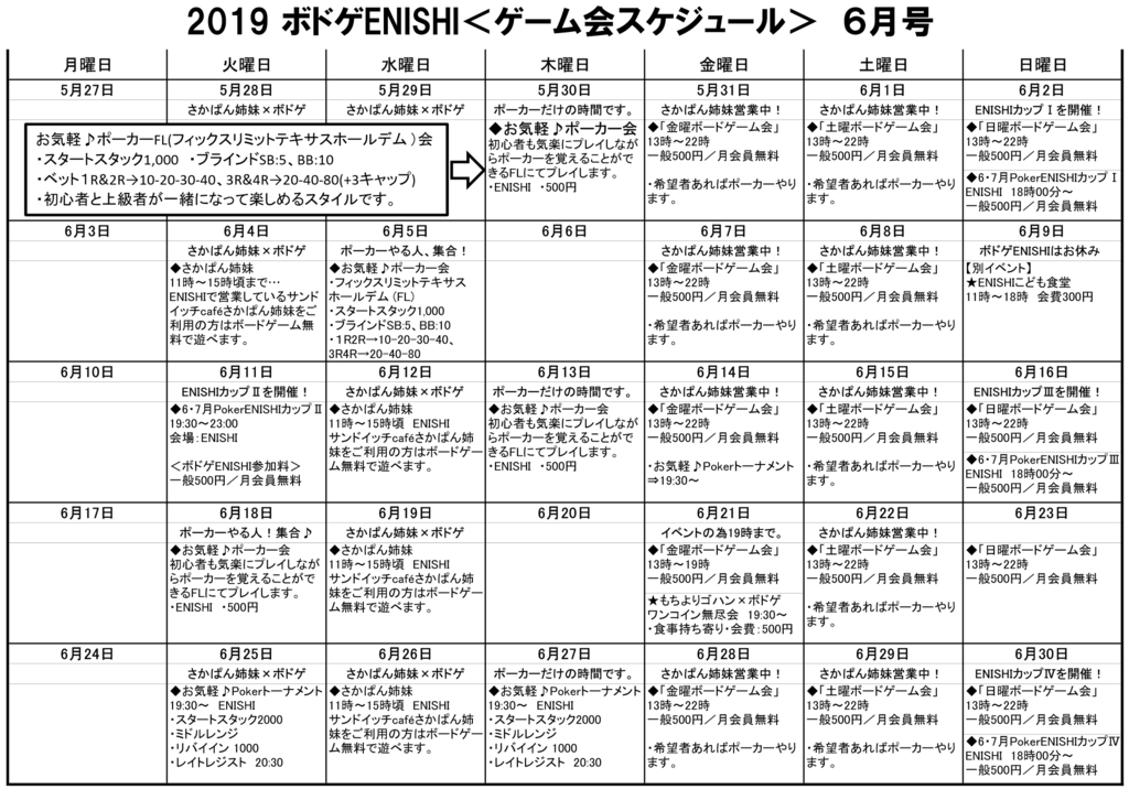 【近日の開催案内】 ◆6月1日(土)13:00~22:00【土曜ボードゲーム会】 ◆6月2日(日)13:00~22:00【日曜ボードゲーム会】 ⇒18:00~「6・7月PokerENISHIカップⅠ」を開催! ◇6月4日(火)さかぱん姉妹×ボードゲーム ⇒11:00~15:00サンドイッチcafeご利用の方は無料でボドゲプレイ可能 ◆6月5日(水)夜はポーカーのみのイベント ⇒11:00~15:00サンドイッチcafeご利用の方は無料でボドゲプレイ可能 ⇒19:30~22:00「お気軽♪ポーカーFL会」 ◆6月7日(金)13:00~22:00【金曜ボードゲーム会】 ◆6月8日(土)13:00~22:00【土曜ボードゲーム会】 ◆6月9日(日)※ボドゲENISHIはお休み ⇒11:00~18:00別イベント【ENISHIこども食堂】 ◆6月11日(火)夜はポーカーのみのイベント ⇒11:00~15:00サンドイッチcafeご利用の方は無料でボドゲプレイ可能 ⇒19:30~23:00「6・7月PokerENISHIカップⅡ」を開催! ◇6月12日(水)さかぱん姉妹×ボードゲーム ⇒11:00~15:00サンドイッチcafeご利用の方は無料でボドゲプレイ可能 ◆6月13日(木)ポーカーのみのイベント(初心者向け) ⇒19:30~22:00「お気軽♪ポーカーFL会」 ◆6月14日(金)13:00~22:00【金曜ボードゲーム会】 ◆6月15日(土)13:00~22:00【土曜ボードゲーム会】 ◆6月16日(日)13:00~22:00【日曜ボードゲーム会】 ⇒18:00~「6・7月PokerENISHIカップⅢ」を開催! ◆6月18日(火)夜はポーカーのみのイベント ⇒11:00~15:00サンドイッチcafeご利用の方は無料でボドゲプレイ可能 ⇒19:30~22:00「お気軽♪ポーカーFL会」初心者向けポーカー会 ◇6月19日(水)さかぱん姉妹×ボードゲーム ⇒11:00~15:00サンドイッチcafeご利用の方は無料でボドゲプレイ可能 ◆6月21日(金)13:00~19:00【金曜ボードゲーム会】 ⇒19:30~「持ち寄りゴハン×ボドゲ」イベントです。 ◆6月22日(土)13:00~22:00【土曜ボードゲーム会】 ◆6月23日(日)13:00~22:00【日曜ボードゲーム会】 ◆6月25日(火)夜はポーカーのみのイベント ⇒11:00~15:00サンドイッチcafeご利用の方は無料でボドゲプレイ可能 ⇒19:30~23:00「お気軽♪ポーカートーナメント会」 ◇6月26日(水)さかぱん姉妹×ボードゲーム ⇒11:00~15:00サンドイッチcafeご利用の方は無料でボドゲプレイ可能 ◆6月28日(金)13:00~22:00【金曜ボードゲーム会】 ◆6月29日(土)13:00~22:00【土曜ボードゲーム会】 ◆6月30日(日)13:00~22:00【日曜ボードゲーム会】 ⇒18:00~「6・7月PokerENISHIカップⅣ」を開催! ボドゲカフェENISHI(人狼ルーム@山梨) 遊べるゲームは350種類以上!! 【営業時間(予約なしで参加OK)】 <月曜日> 夜のみ、リクエストあれば開催(会場MISSION) ⇒イベント情報をご確認ください <火曜日> 夜のみ、リクエストあれば開催(会場MISSION) ⇒イベント情報をご確認ください <水曜日> お休み <木曜日> 13:00~21:00(オープン会) <金曜日> 13:30~21:00(オープン会) <土曜日> 13:00~21:00(オープン会) <日祝日> 状況によってなるべく開催 ⇒イベント情報をご確認ください ENISHIイベント情報↓↓↓ https://bodoge.hoobby.net/spaces/enishi/events 何時間いてもワンコイン! 500円で遊び放題のスペースです。 木曜日、金曜日、土曜日が開催日となっていることが多く、昼間から夜まで遊べます。 ぜひ、一緒にボドゲをプレイして楽しみましょう♪ <プレイスペースは2タイプ> ①ENISHI こども参加OKでパーティーゲームにもピッタリ!ワイワイ盛り上がれるエリアです。 ②MISSION こどもは入れない。じっくり重量級のゲームをするにもピッタリな集中できるエリアです。 「参加」 ◆電話番号:090-1034-1398 (担当:小澤) こちらに連絡をください。 【ゲームリスト】 https://bodoge.hoobby.net/spaces/enishi/games <会場のレイアウト> ①ENISHI→軽いゲーム中心、パーティー系なども
