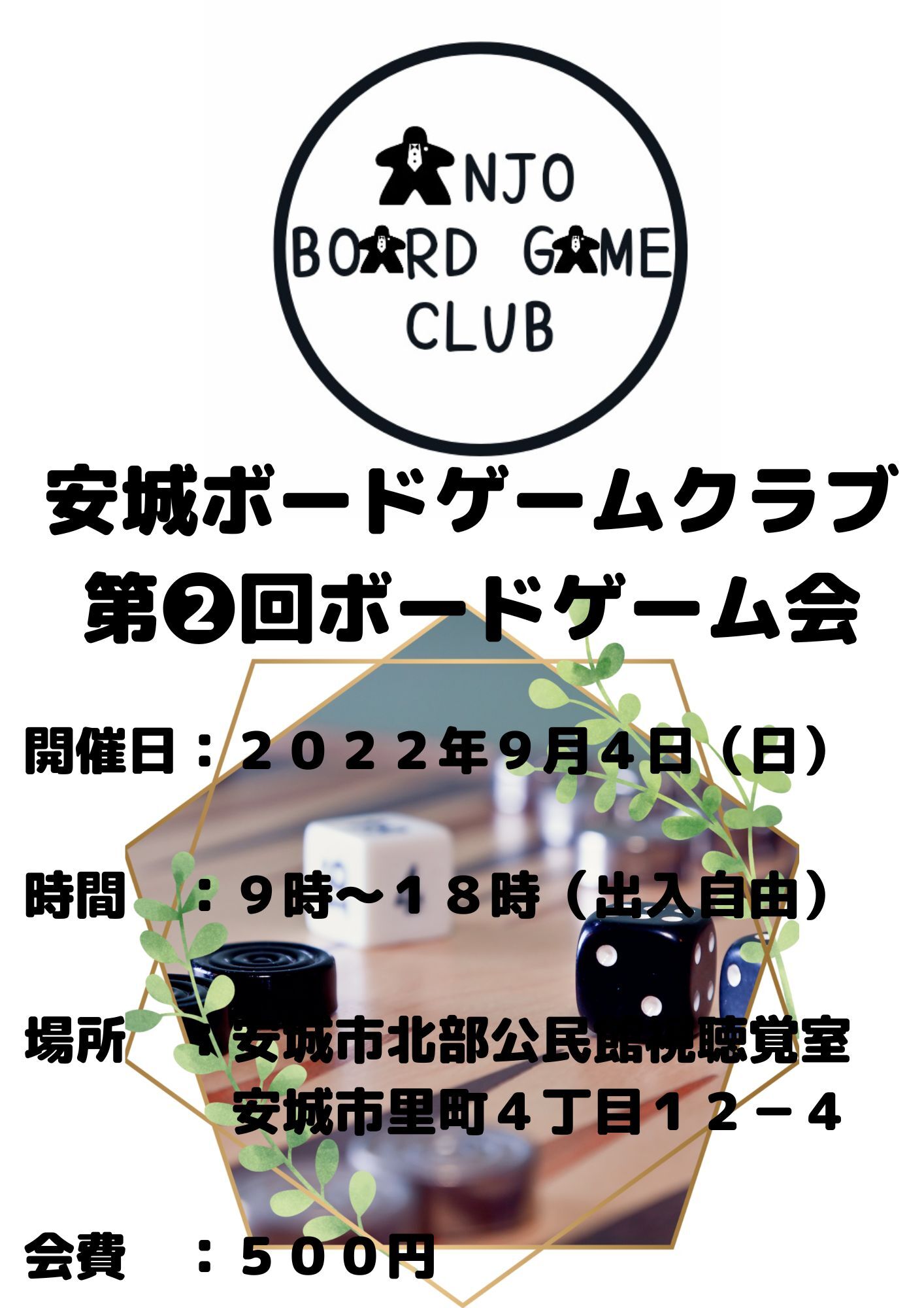【開催日時】 2022年9月4日(日曜日) 9時30分~18時頃(途中参加、退室もちろんOK!) 昼食持ち込み可! 【開催場所】 安城市北部公民館 視聴覚室(部屋変更しました。) (名鉄新安城駅から徒歩10分) 安城市里町4丁目12-1 【会費】 500円 【その他】 ★ルール説明出来る方!ボードゲーム持ち込み歓迎! ★初心者さん!お友達同士での参加大歓迎!! ★参加ご希望の方は、ご連絡ください。当日の連絡等はLINEオープンチャットを活用しております。