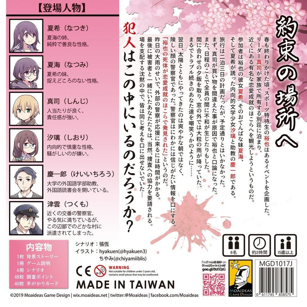 を全力で遊んでみませんか? ※尚、当イベントの開催は、販売元「Moaideas Game Design」様より 事前に許可を頂いております。 日時:7月18日(木)19:00~23:00 参加者:6名(先着) 参加費:¥990 ※参加者が集まらない場合は中止となります。 ★プロローグ★ 「知ってる?ほこらの前の桜の下で祈りを捧げた二人は、永遠に愛し合うことができるんだって──」 昔々、ここは小さな村であった 村長の娘は美しく、村の男性全員の憧れの的 その目は夜空に輝く星のようで、長い黒髪は絹織物を彷彿とさせる 父親である村長は彼女を村一番の有力者である富豪と結婚させようとしていたが 彼女は、幼いころから面倒を見てくれていた男性に想いを寄せていた 身分の違い、家族の反対、いずれも二人の愛ゆえの決意を止めることはできない 駆け落ちの夜、約束した桜の木の下へ彼女はやってきた しかし、そこで見たものは怒りに震える村長と、男性の死体 傷心した彼女はみずから命を絶つ道を選ぶ 村人たちが慌てふためいているとき、満開の桜が散り始めた 二度と離れ離れにならないよう、花びらが2人をしっかりと包み込む そして、彼女は桜の根元で精霊となり、ここで祈りを捧げる恋人たちを守っている… ♦マーダーミステリーについて♦ 参加者は殺人事件の当事者となり、犯人探しと、其々個人別のミッションの両方を追及していく ロールプレイング型推理ゲームです! 犯人は配役で決まっているため、1つのシナリオは生涯に1度しか遊べない体験ゲームとなります。 ※イベント参加の注意点 イベントは120~150分程を想定しております。 こちらのシナリオは生涯に1度しか遊べない体験ゲームです。 まだ遊べていない方、これから遊ぶ方の為にも、ネタバレとなる「シナリオ」「カード」「犯人」「結末」の内容や感想、 画像等はSNS等での公開は一切禁止されております。 参加される方は以上の注意事項をご確認、同意頂いた方のみ予約をお願い致します。 製作者Moaideas Game Design(@Moaideas)様からの利用ガイドラインはこちらになります。 参加希望の方は、事前予約必のみとさせて頂きます。 6人専用ゲームの為、参加者が集まらない場合は中止となります。 中止の際は、前日までにTwitterにて告知します、予めご了承ください。 事前予約は、当店問い合わせフォーム、TwitterのDM、店頭にて受付中です。 |