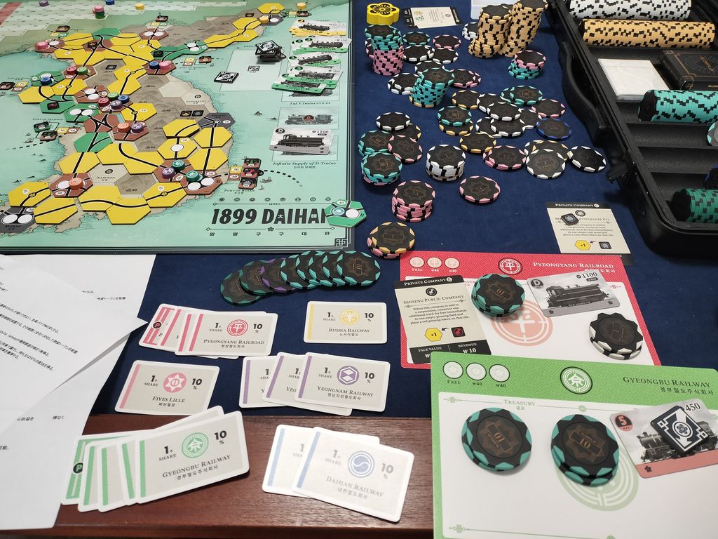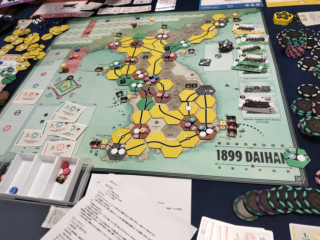 終了後盤面。インスト込み4時間?四国よりも少し重いくらい。感覚的にはロストアトラスロングゲームくらいの重さ。 盤面的にはソウル、釜山、右上のよく分からん街等の高収益拠点をいい感じに奪い合おう。
