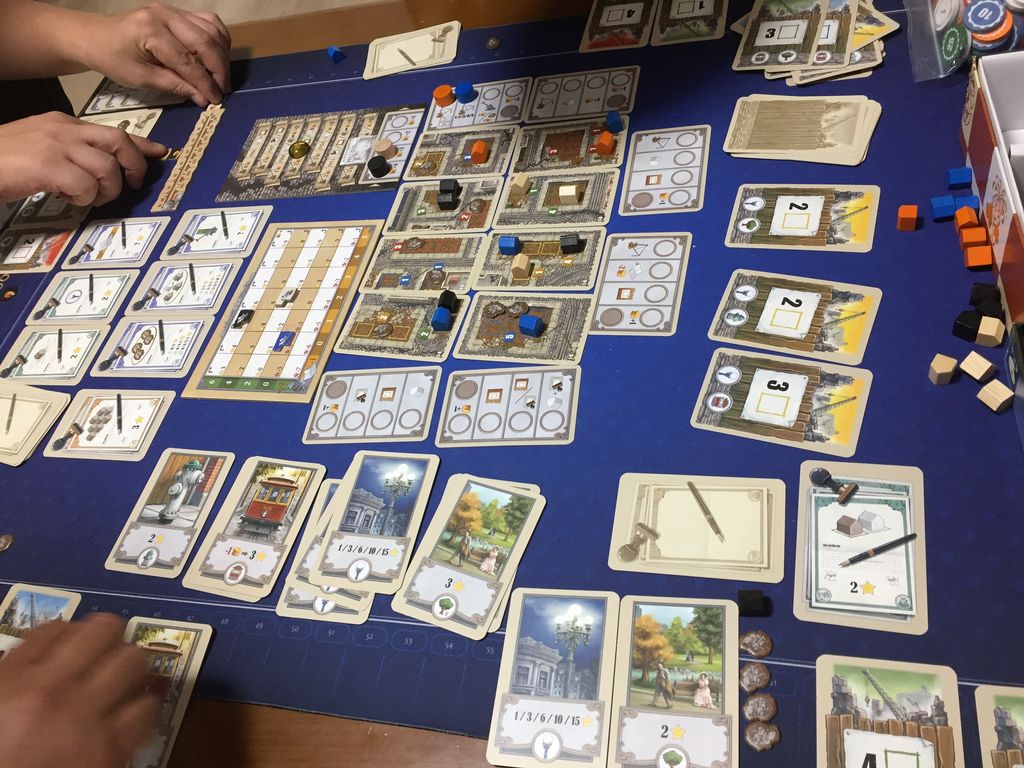 通常のワーカープレイスメントにあるような、ワーカーが6つずつぐらい持っており、置いていく、というタイプではなく、必ず1つずつのため、ゲームの進行がゆっくりに感じる人もいるかもしれません。