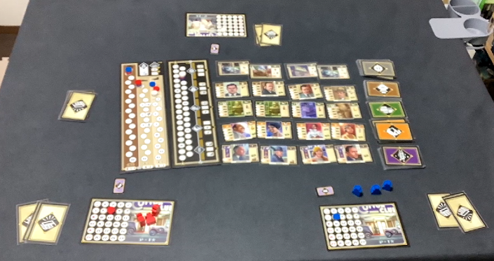 こちらは3人用のコンポーネントを広げています。ボードは左側にある折りたためるコンパクトなトラックボードが2つ、あとはカードで構成されています。