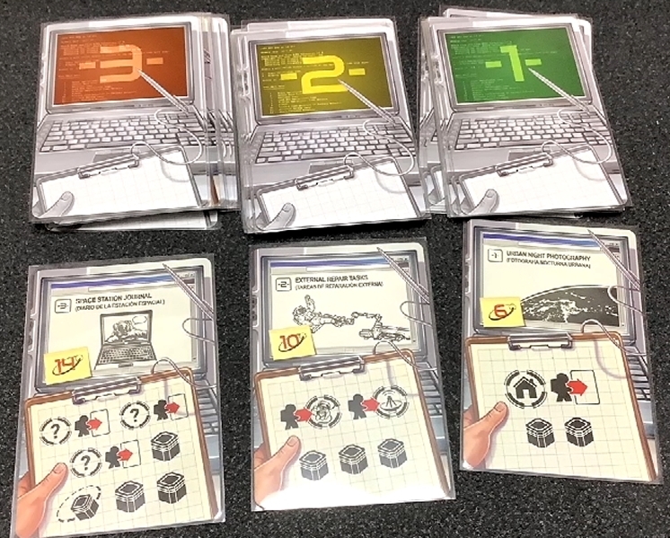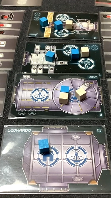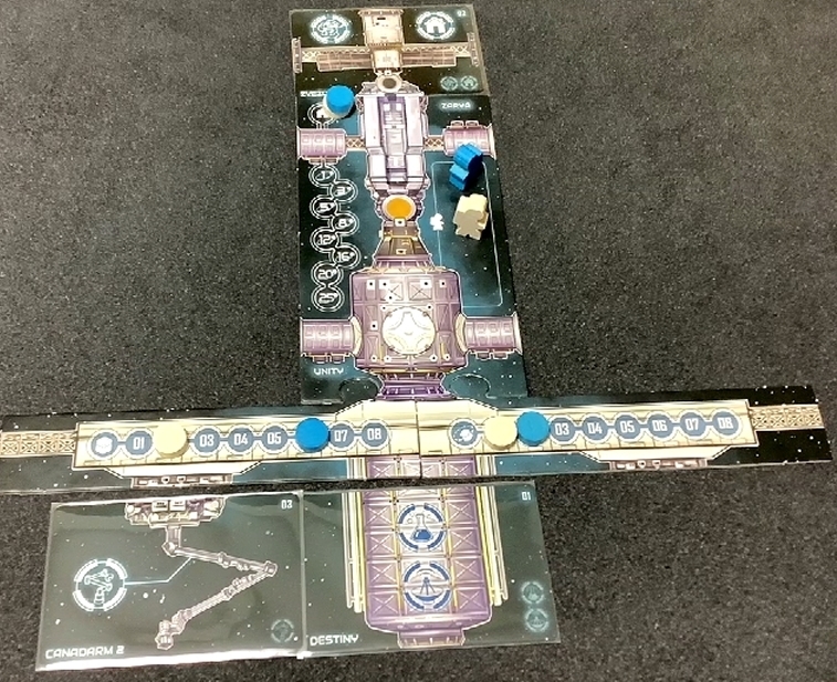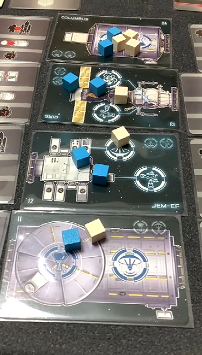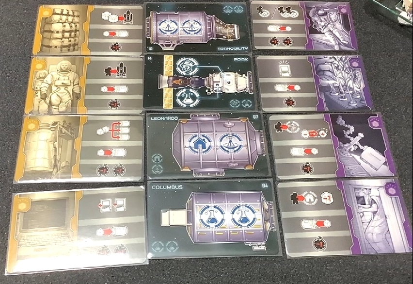 しかもこのゲームの箱が小箱サイズでまとめられており、ISSやシャトルのモジュール以外はすべてカードで構成されているおかげで、左右のアクションの位置がランダムで決まるので、毎回プレイ感が変わってきます。
