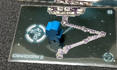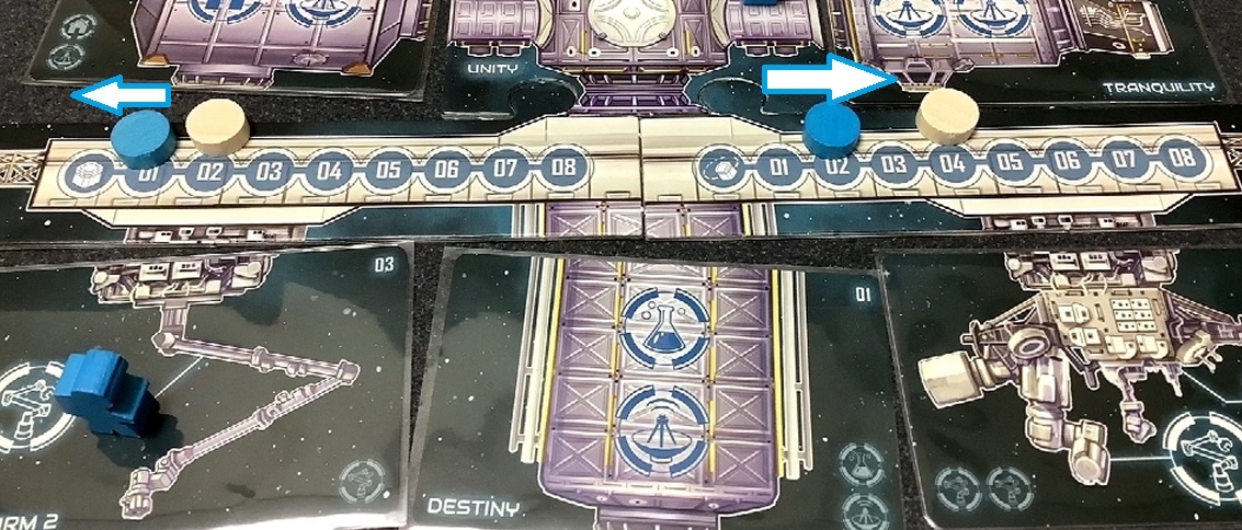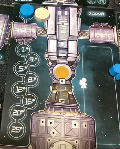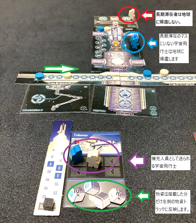 宇宙飛行士を長期滞在区画に移します。そして左側にあるトラックを進めます。トラックの下に書かれている数字は直接勝利点になります。