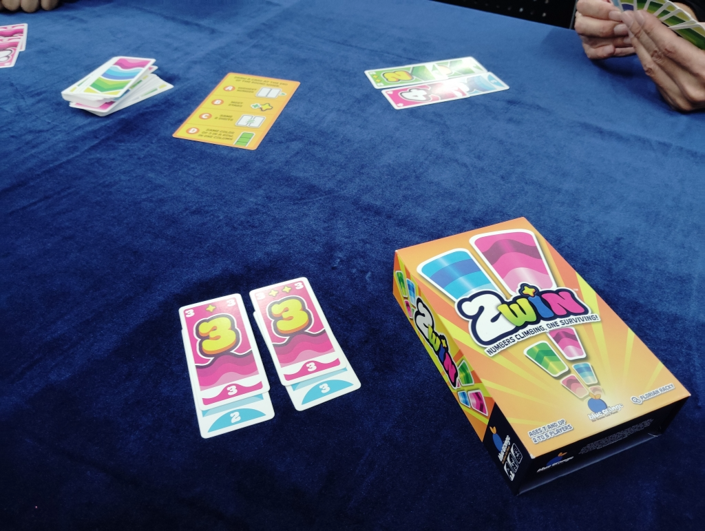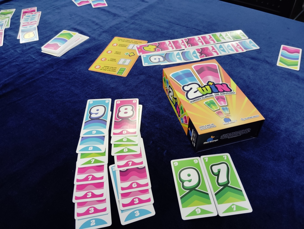 2枚のカードで10の位、1の位を使った数字を自分の前に出して重ねていき、毎ラウンド、数字は大きくしていかないといけない脱落ありのゲーム。