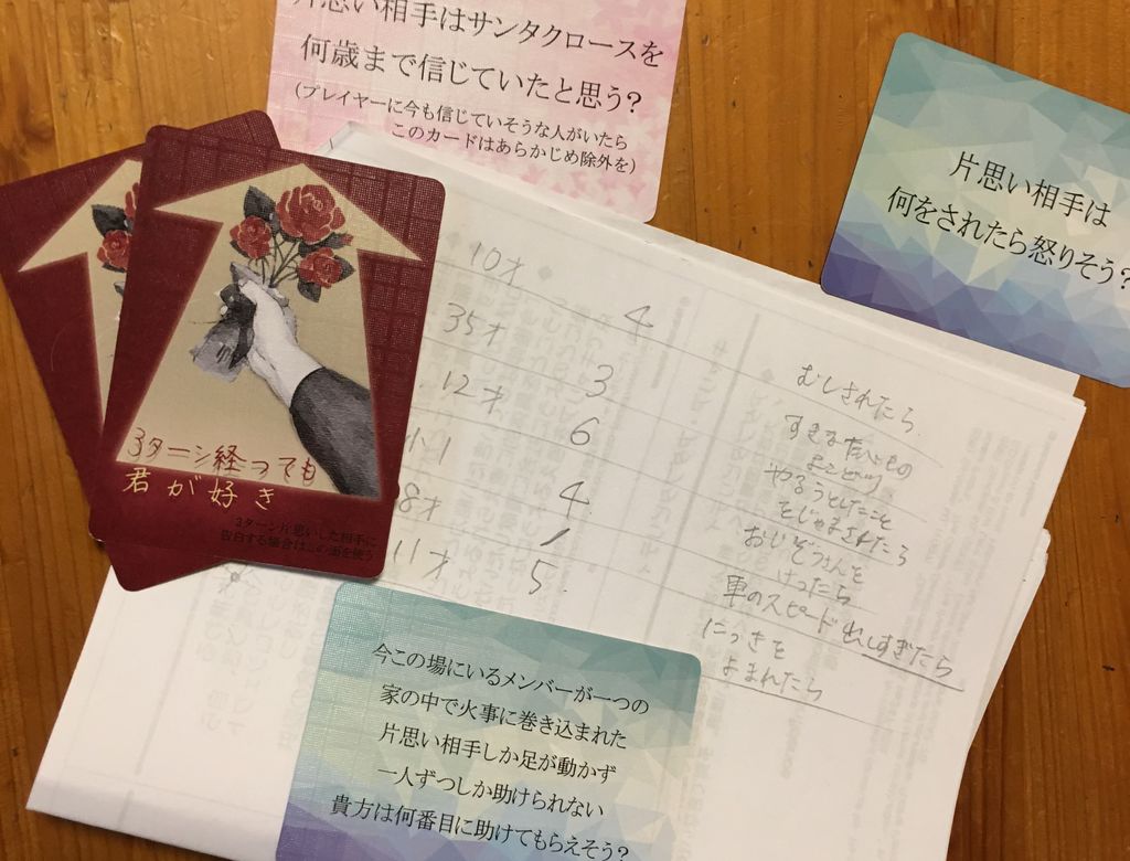 最初に「みんながこの順番で並んでいる想定」の図を描いて共有します。このゲームを持っている私が一人ずつに、片想い相手を決めるカードをひいて見せていきます。他の人は見ないようにしてもらって。私が選んだ質問カードを読み上げて、みんなに答えにもらいます。最後はそれぞれが相手の名前と「告白」か「受入」かをメモに書いてもらって一斉に見せるという方法です。