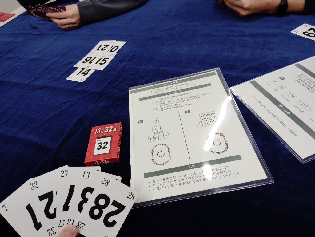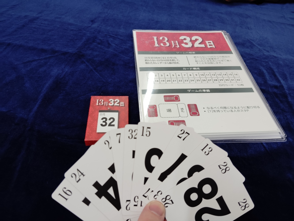 1〜32のカレンダーカードを使用し、すべてのプレイヤーに配り切り、1のカードを所持しているプレイヤーがスタートプレイヤーになります。