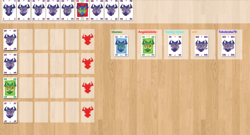 6列目の牛のマークのところにカードを出した人がその前までのカードを引き取り、失点を受けるゲームになっています。