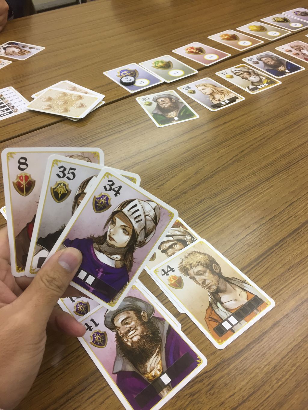 というのは、得点として取ったカードは色別に分けられて、他のプレイヤーと比べられます(つまり取ったカードはオープン情報ということです) そのため、後1枚集めれば、ということが分かりやすくなり、さらに、手札はあれば使わなくてはならないため、「得点の予定」で持っていたカードを出す必要が出てきたりします。