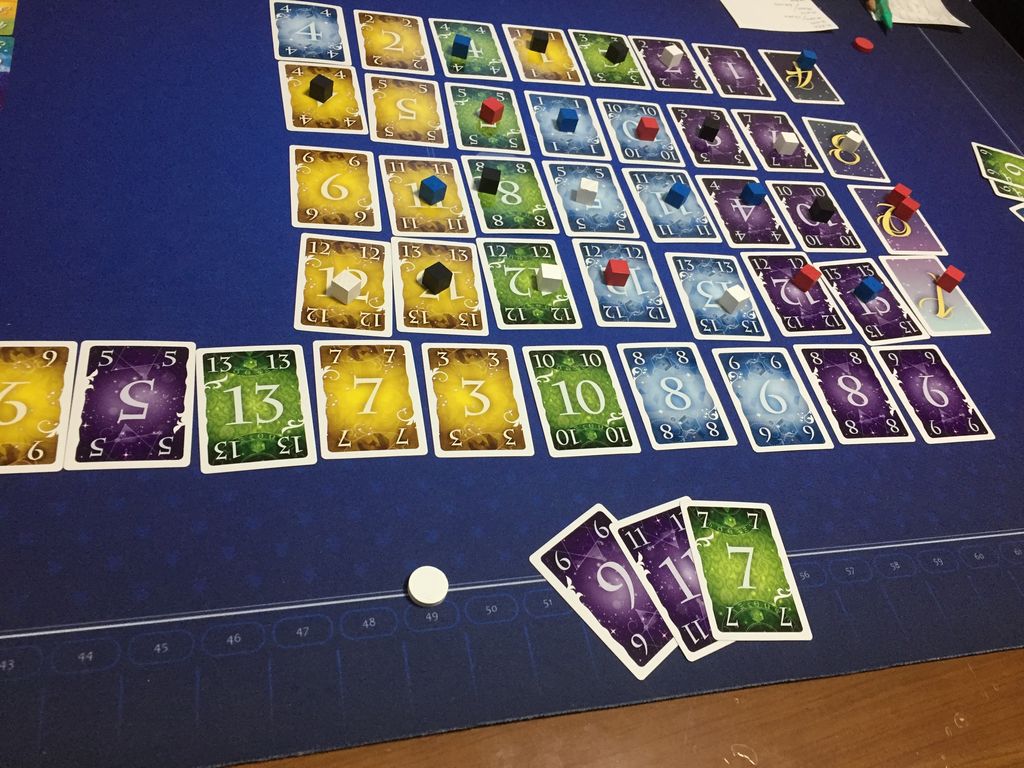 こうして、全員が1枚ずつ出したら、順位の確認して、達成で来ていたら、そこに自分のキューブを数字カードの上に置いたキューブから移動させます。