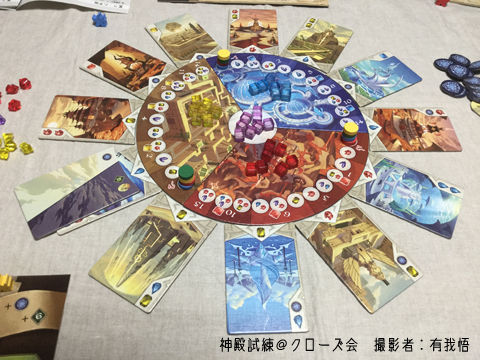 ロンデルっぽくカードを置いてありますが、このゲームはもっホイ+ワカプレです。何だって~~~!! 円形のエリアを取り囲むタイルにワーカーを置き、置いたタイルに描かれたアイコンの資源すべてをゲット&他プレイヤーがいない両隣のタイル下部の三角部分に描かれた資源をゲットして、中央部のマスを(資源を支払って)ガンガン進めて点数を伸ばしましょうというゲームです。中央エリアのスタート地点3カ所有りますが、一個も駒を動かさないラインはマイナス点なので、点数を伸ばすエリアを偏らせるのはだめ、他のプレイヤーが先にいるマスには入れない代わりに、そのマスに入るのに必要な資源を払わなくていいので、基本後番がめっっっっっちゃ有利なゲームです。