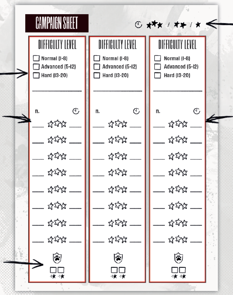 各事件の後、次のページに記載されているキャンペーンシートのいずれかを使用してスコアを記録します。キャンペーンが終了したら(最後まで行ったか、早期に終了したかにかかわらず)、獲得した星を合計し、使用したバッジごとに星を1つ差し引いて、パフォーマンスを確認します。最終スコアで探偵ランクが獲得されますが、はしごをどこまで登ることができますか?