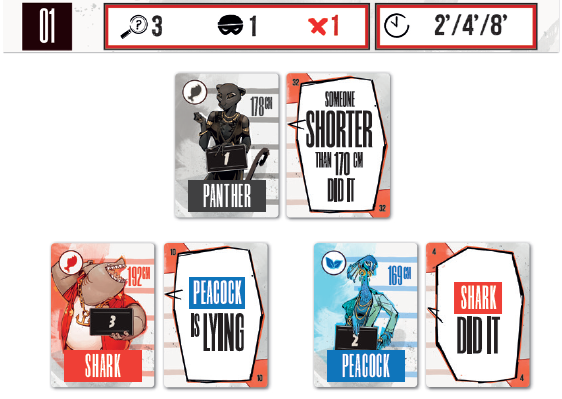 リストされた供述書は、左から右に指定された順序で、最初のカードが容疑者1の隣に、2番目のカードが容疑者2の隣に、というように、容疑者カードの横に裏向きに配置されます。 |