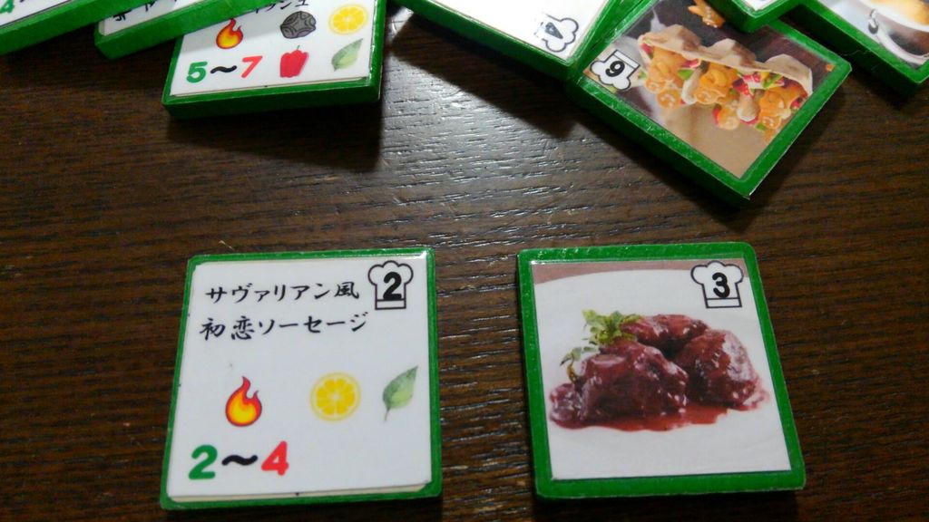 「料理のゲーム?やってみたい!」と、こども達と3人でプレイしましたが、旧版でレシピタイルを日本語訳なしで行なったため、料理を作るというよりはビン/サイコロを振って条件を満たすだけのゲームになってしまいました。