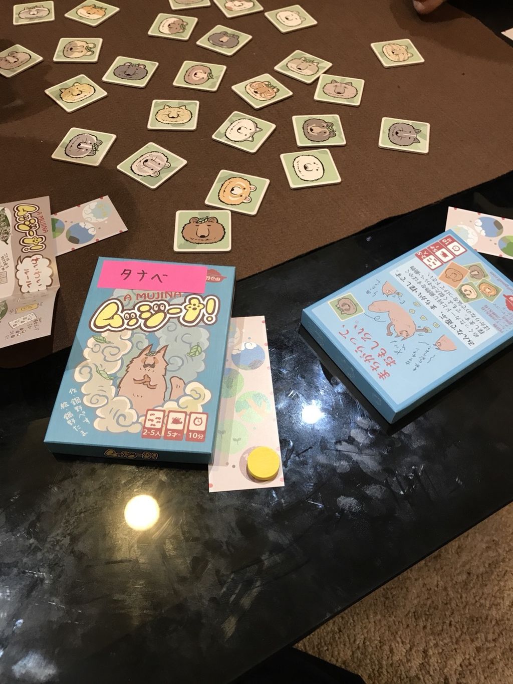 お題カードが全員4枚ずつ配られて(かるたでいう取り札的な)それに合うものを全部早くとれば勝ち!1位2点、べった0点、残り1点!!
