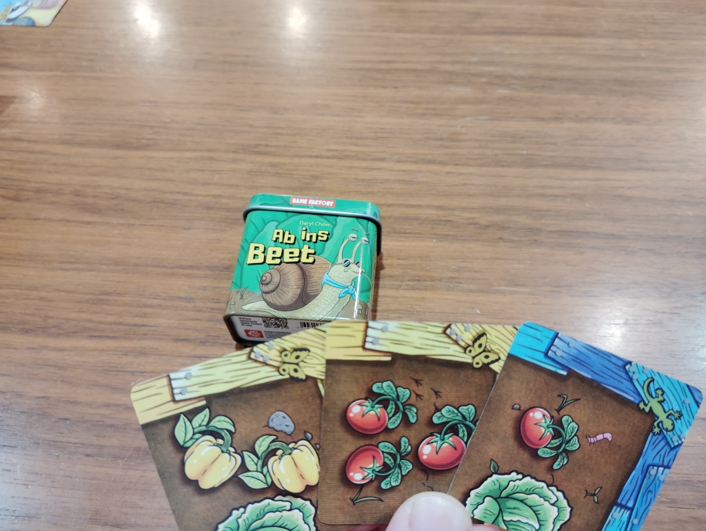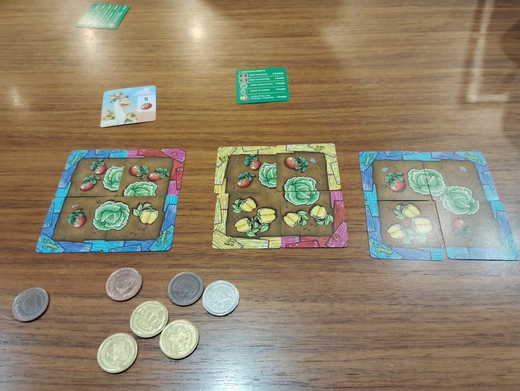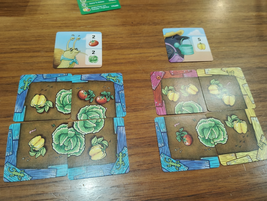 2人で遊んだので山札からカードを3枚受け取ったら、1枚は自分の畑になるカードにして残りの2枚は相手に渡します。