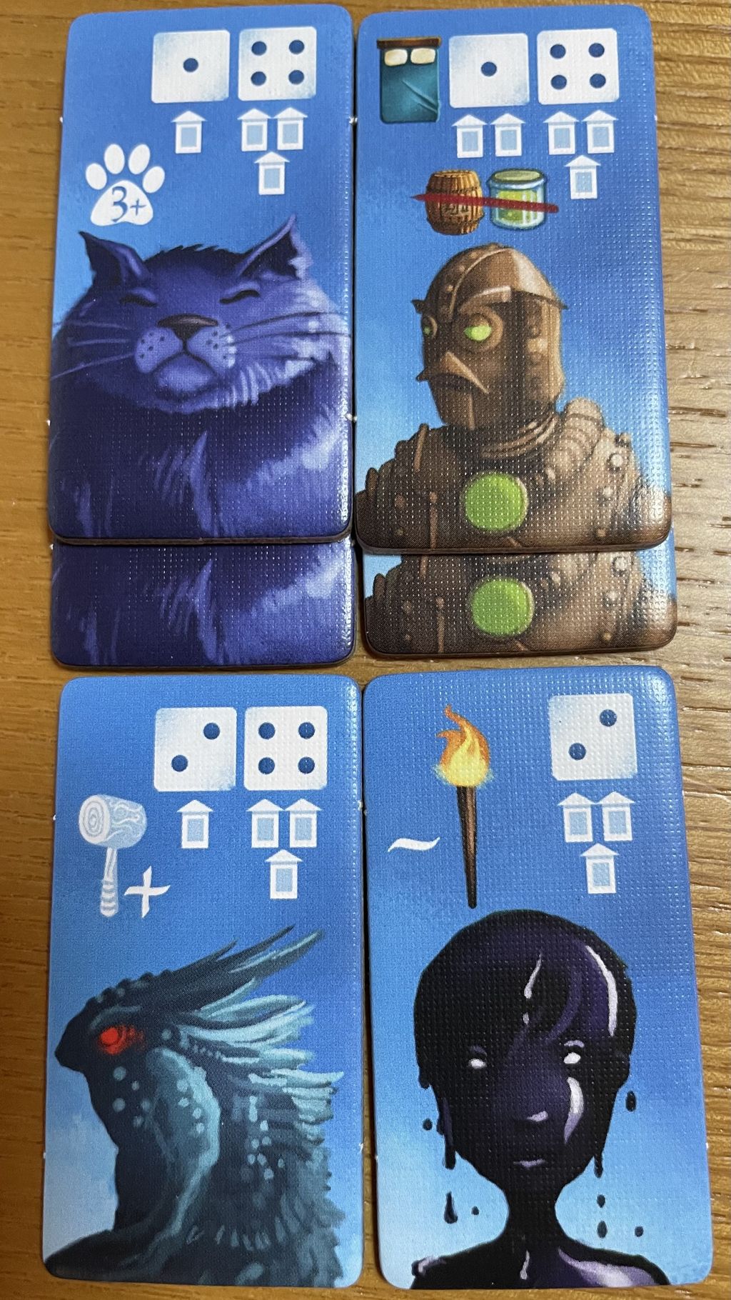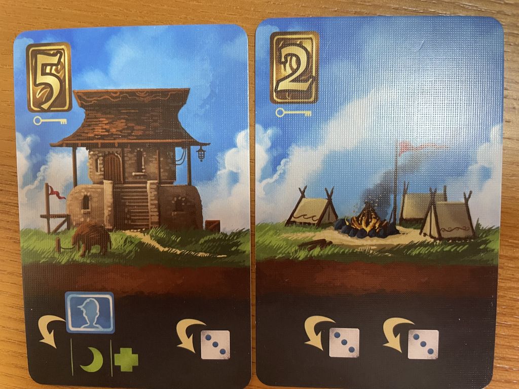 ⇨もともとダイスゲーなのに、ダイス振り直し等々の超絶強化付きの鍵マークの家。先取りで好きな物件を選べるのだけど、それだけに収まらず、使用済みのワーカーを即時復活させられるリンゴ酒を取りに行く。ルールブックを読み違えてないなら、何と鍵の家を2件建てられる開幕デスコンボ!鍵の家は4件しかないから、4人目のプレイヤーがもうこうなったら、やさぐれるしかない。そんなのがあってもスタPが必ず勝つ訳ではないぐらいの運ゲー。