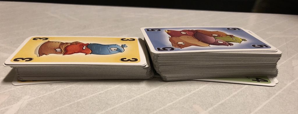 3〜7までの連番数字が各数字約20枚入っていて、各プレイヤーには手札として3枚配られており、自分の手番になったら手札から1〜3枚を場に出していきます。ちなみに、パスはできませんで、必ず1枚は手札からカードを場に出す必要があります。