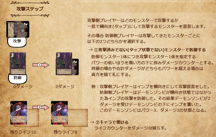 ※各山札は0枚になった時点で即座ににそれぞれのプレイヤーに3ダメージ与えた上で捨て札をシャッフルして山札を作り直す。
