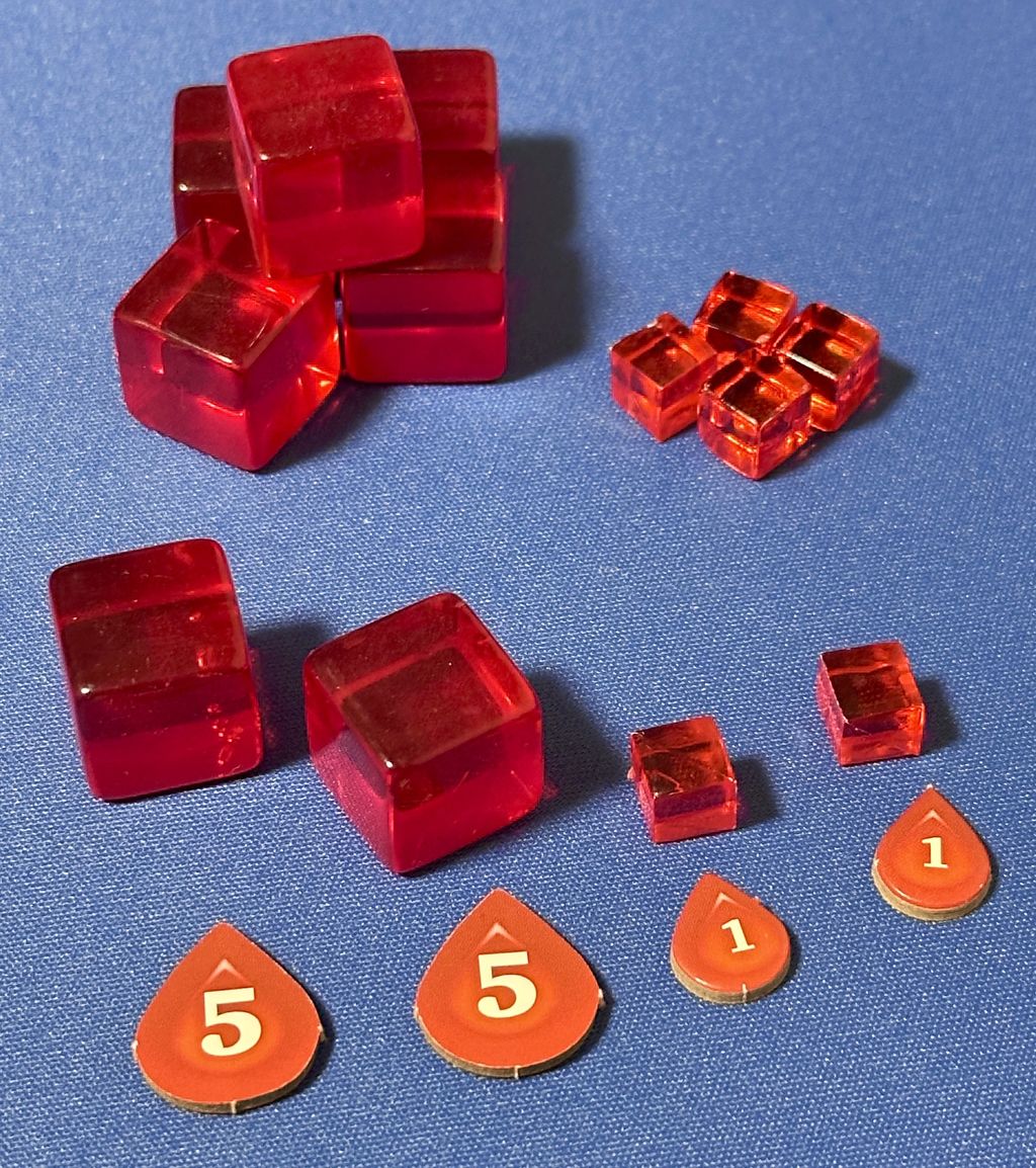 (トークンの差し替え。小さい赤キューブは「パンデミックレガシー」のもの。大きい赤キューブは透明赤ダイスを使用。楽天で買えます。なお、大キューブは5じゃなくて3として使うと便利です。)