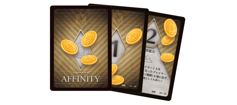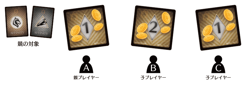 ※報酬カードの中には競を操る能力を持つ交渉能力付きの報酬カードが含まれ、シンプルな競のルールをいっそう奥深くします。