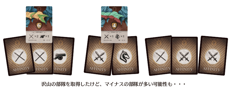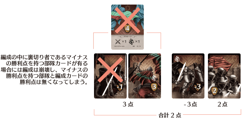 マイナスの勝利点を持つ部隊もあるので慎重に必要な部隊を競り取る事が重要です。更にマイナスの勝利点を持つ部隊が軍編成に入っている場合は、編成が崩壊して追加の勝利点を得る事が出来なくなってしまいます。