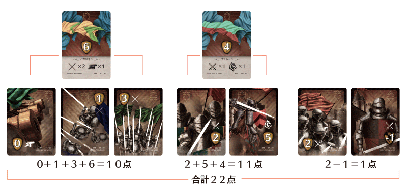 競りの対象となった部隊はゲームの終了時までその他のプレイヤーは内容を確認する事が出来ない為、例えたくさんの部隊を保有していても本当に勝っているとは限りません。ゲーム終了時の得点計算時に初めて勝敗が決するのです。