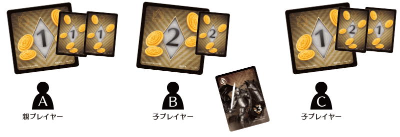 親のみが競りの対象を決めて、部隊カードの表の勝利点を確認する事が出来ます。その為、