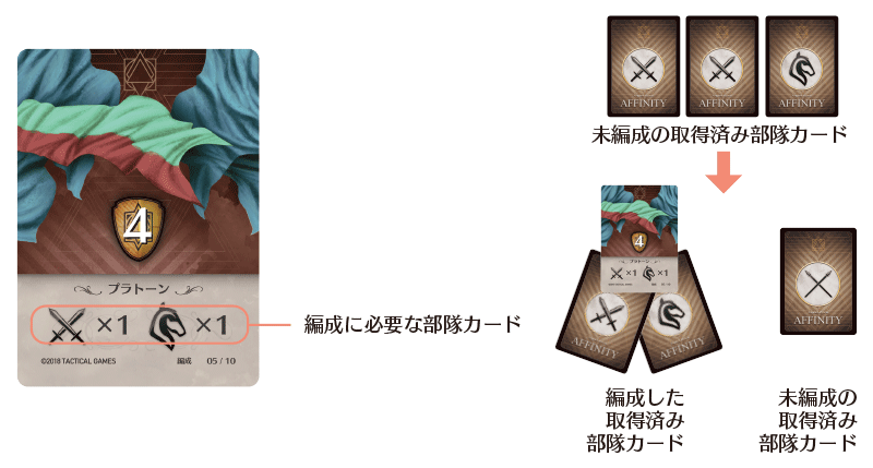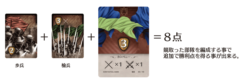 取得した部隊を編成する事で追加勝利点を得られます。編成する為にはカード内に書かれている条件に合う取得済みの部隊を編成に組み入れます。