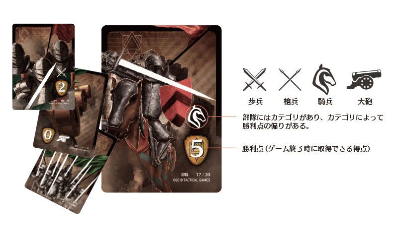 勝利点を持ち、競の対象となるカードです。歩兵・槍兵・騎兵・大砲の4カテゴリからなり、それぞれに勝利点の偏りがあります。