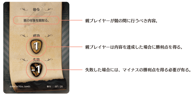 親プレイヤーが競を行う際に達成すべき行動が書かれたカードです。勅令内容を達成し、成否によって追加の勝利点やマイナスの勝利点を受け取ります。