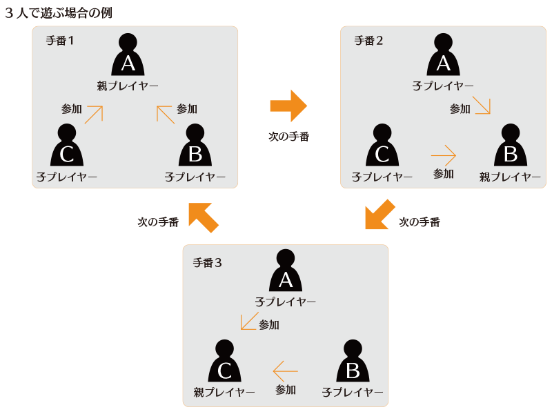 スタートプレイヤーが親プレイヤーとなりゲームを進めます。親プレイヤー以外のプレイヤーは子プレイヤーとなり親プレイヤーが手番中に執り行う競などに参加します。親プレイヤーの手番が終わったら、左隣のプレイヤーに親を回して順番に手番を行う事でゲームを進め、『部隊』カードの山札からカードを引けなくなったらゲームが終了します。