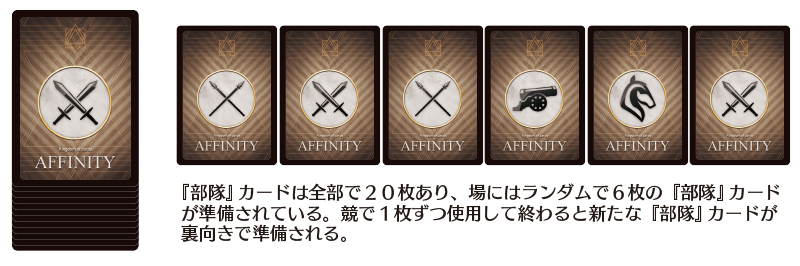 『部隊』カード(勝利点を持つカード)を1つずつ競に掛けプレイヤーが取得していく事でゲームが進行します。