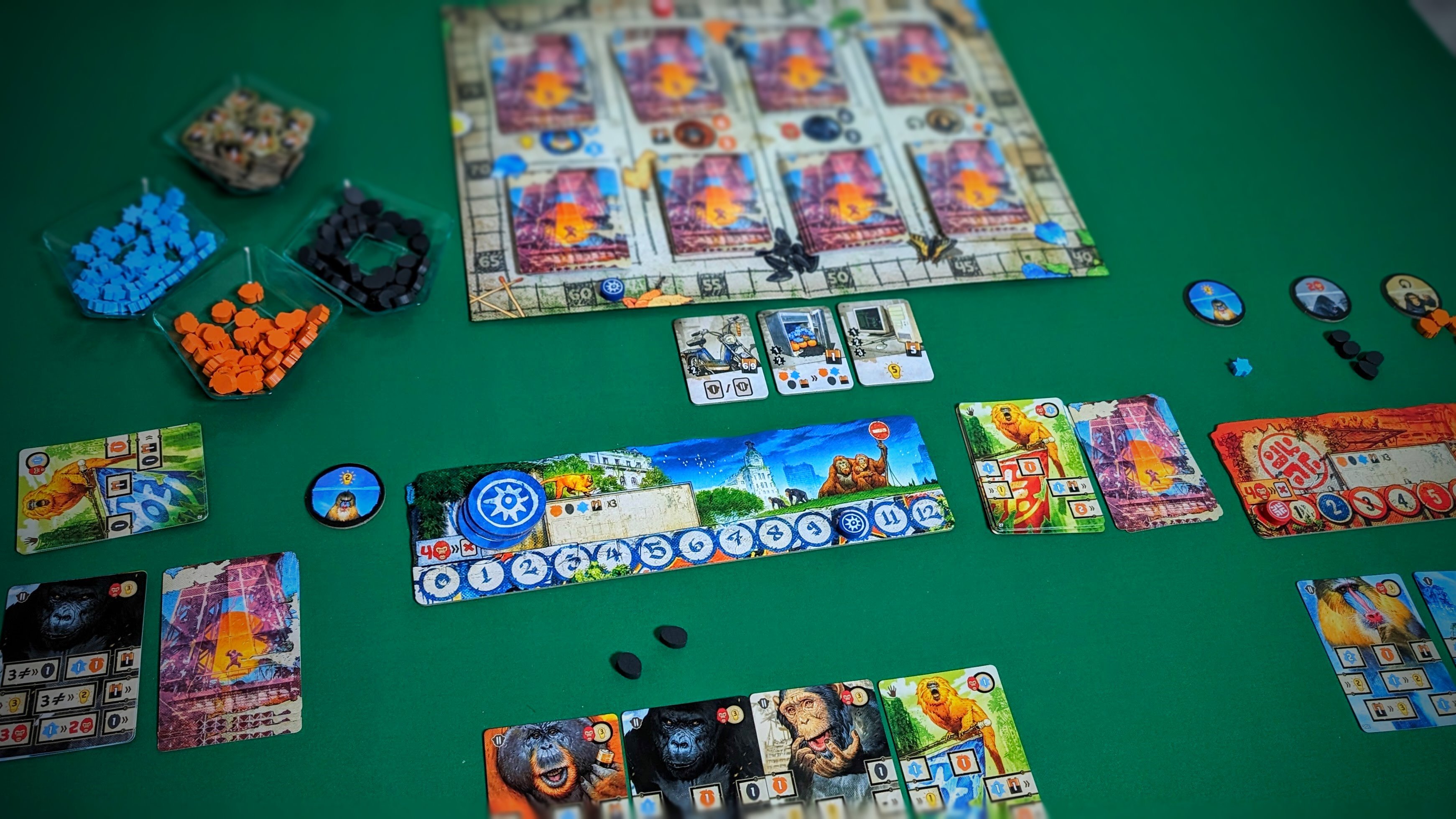 サルの種類には基本のタマリンのほか、カード除外を行う「怒り」リソースを生むゴリラ、遺物を起動する「電池」リソースを生むオランウータン、勝利点獲得に特化したマンドリル、他の能力をコピーするチンパンジーの4種がいて、それぞれ通常のLV1と上位のLV2のカードが場に並んでいる。