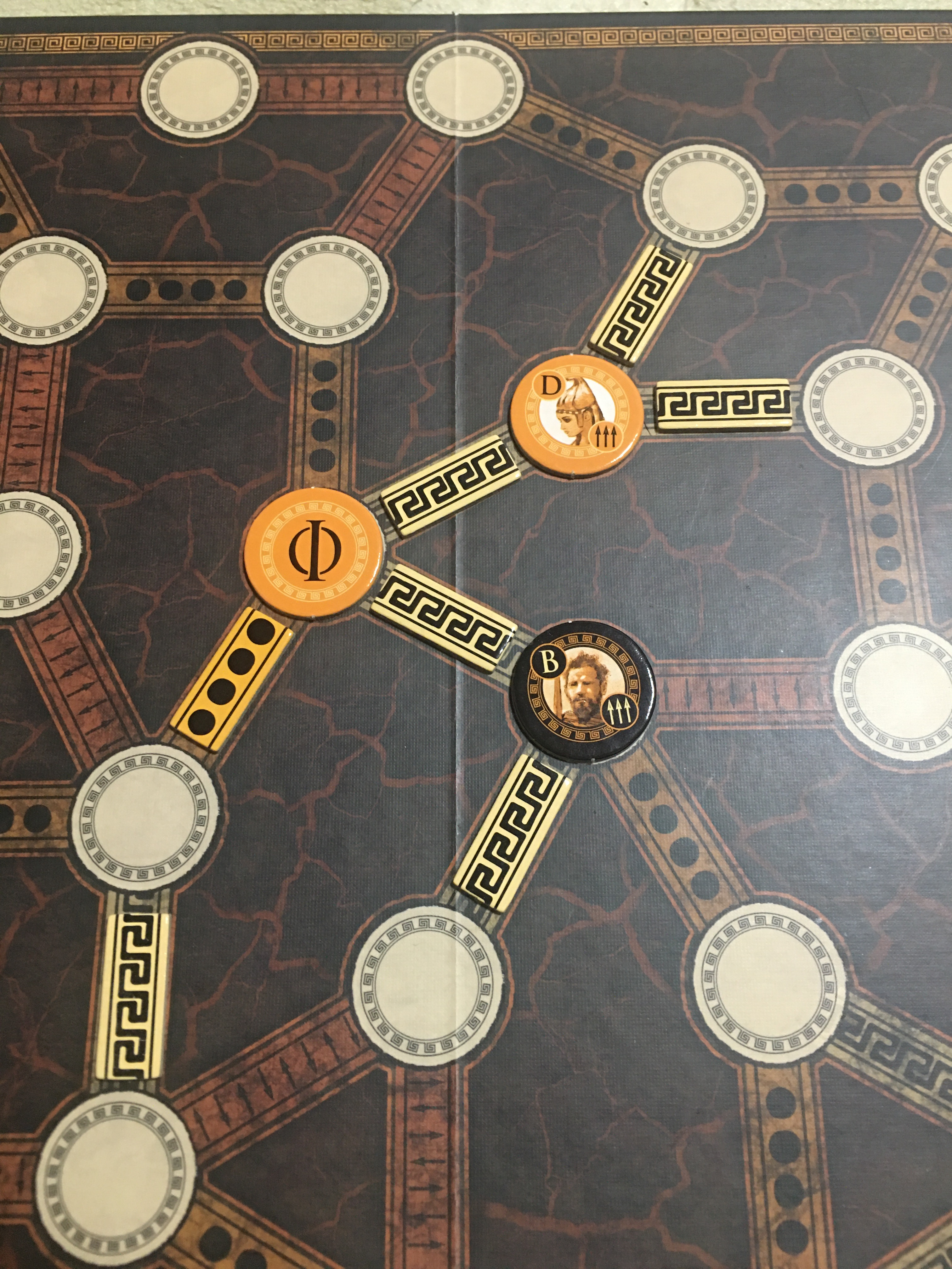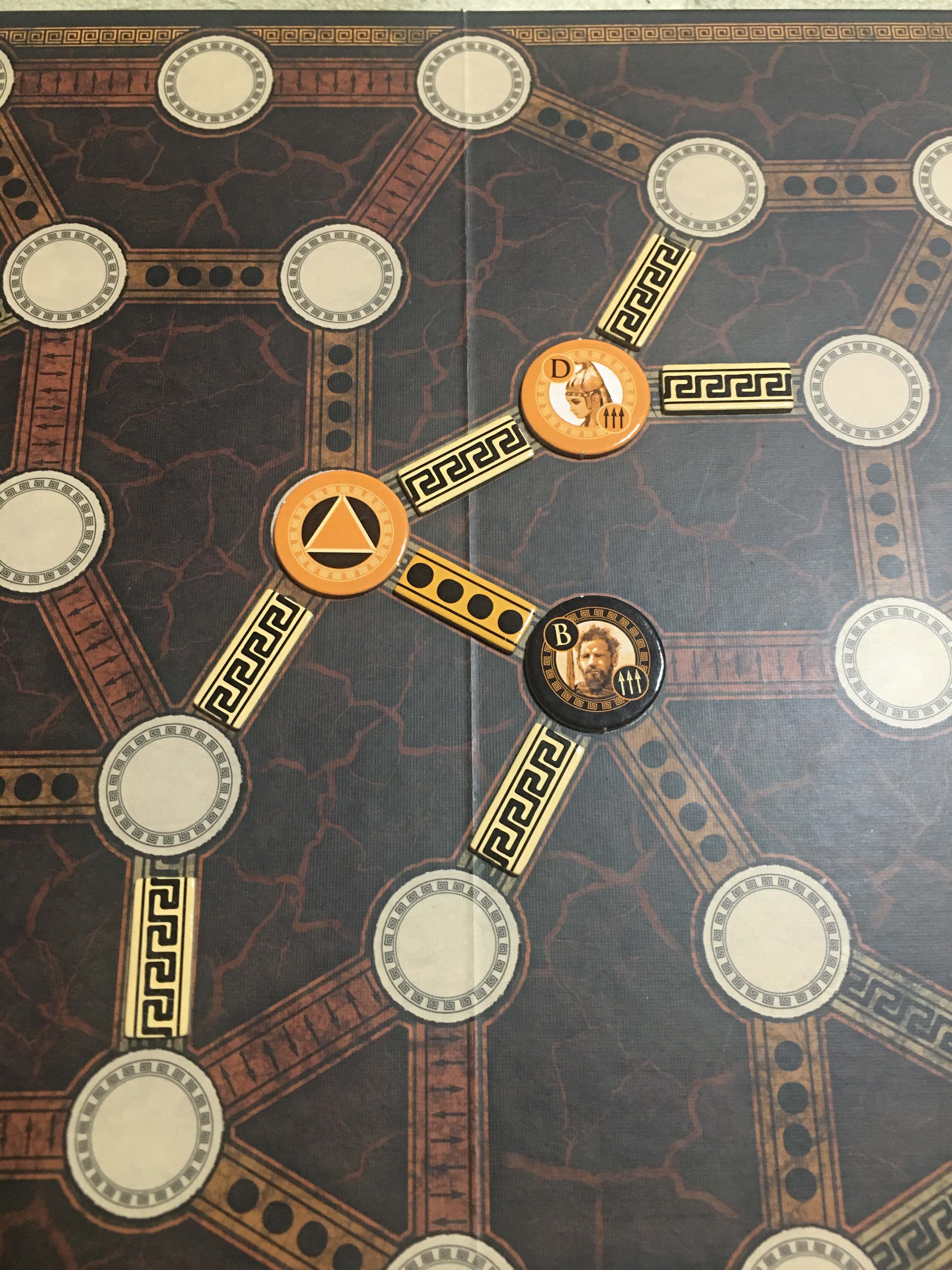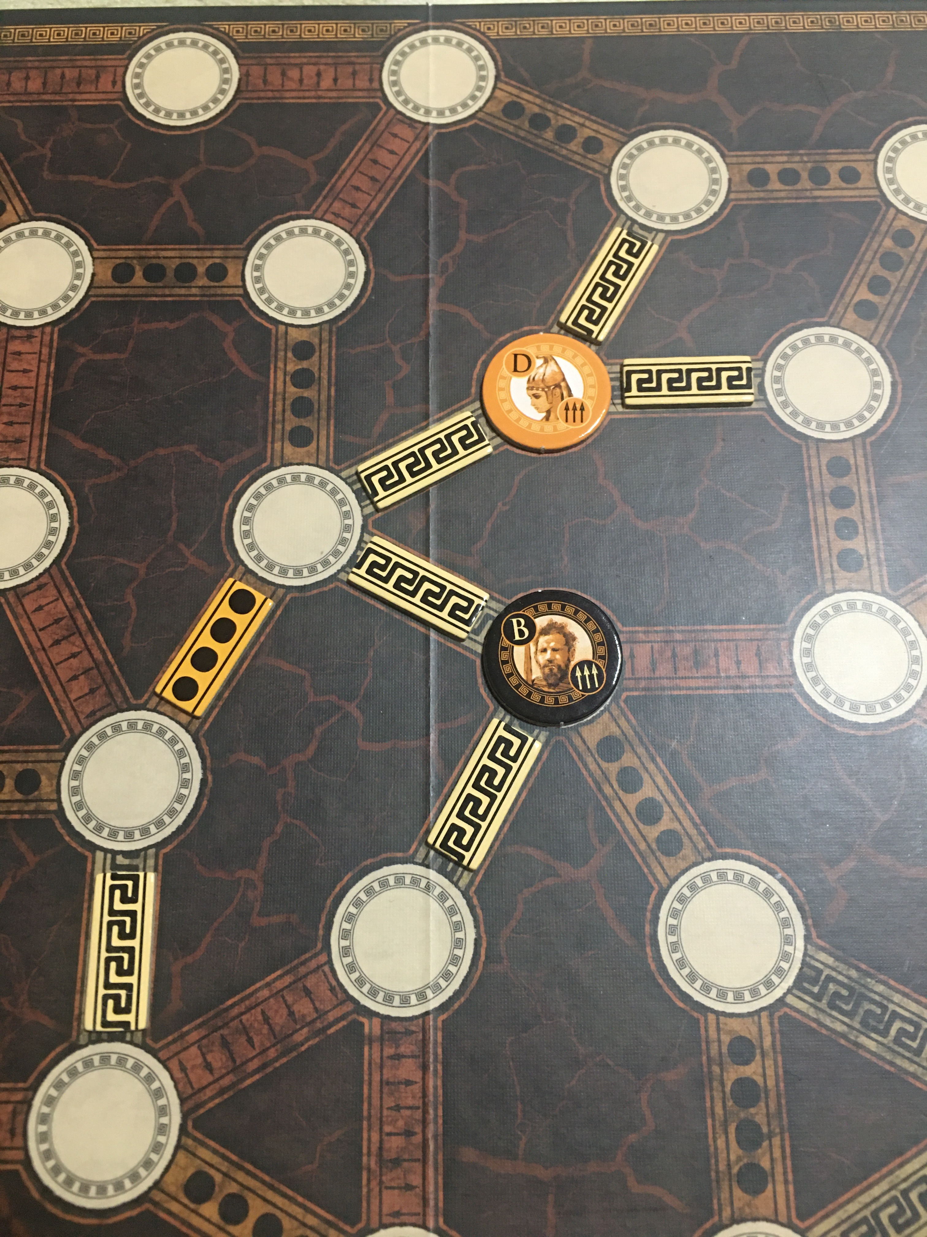 ※オレンジのトロイ側のプレイヤーは、横糸タイルを使って1本の糸を2つに切断しました。それぞれの糸の長さは、糸タイル1枚分です。ギリシャ側のプレイヤーは、右下の糸を2枚コントロールしており、トロイ側のプレイヤーは右上の糸を3枚コントロールしています。