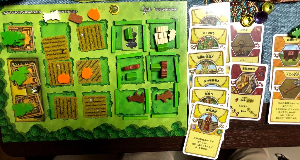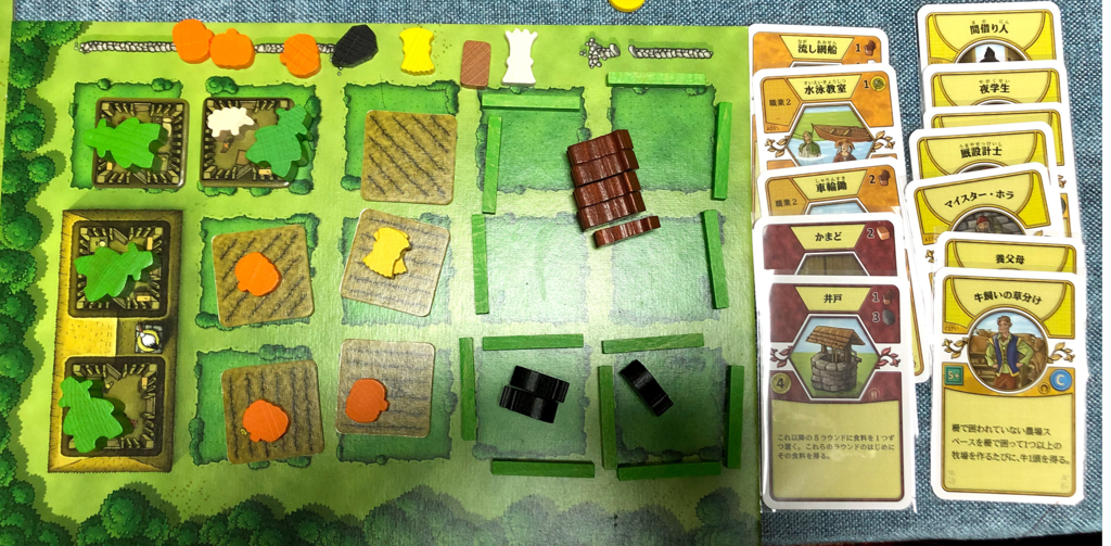 ※最後の柵で生け垣管理人の効果を忘れており本当は牛のところの2本を引き忘れており49点。これを忘れていなければ柵1点、木材を食料にして野菜1点が増えて51点だった。