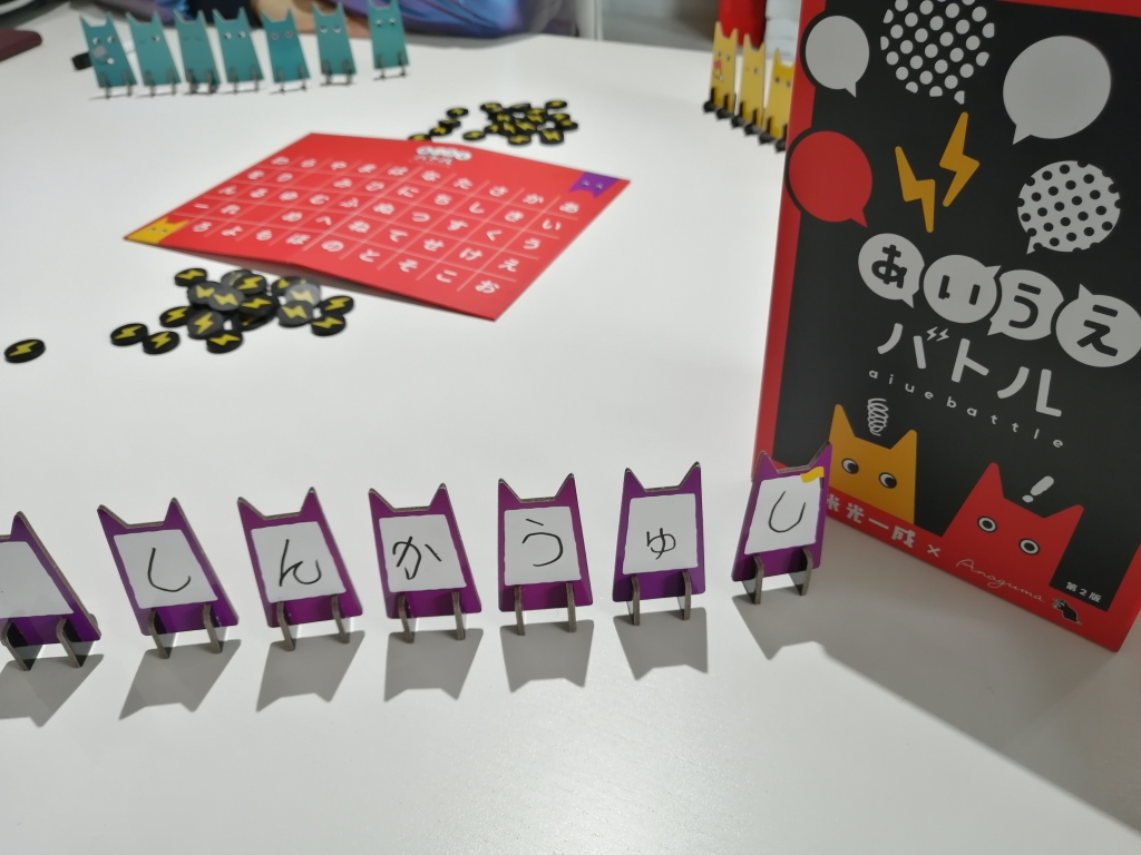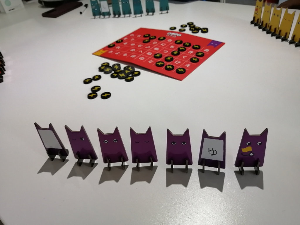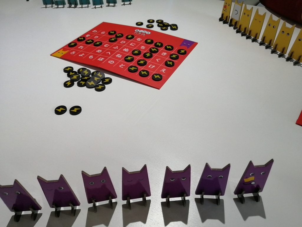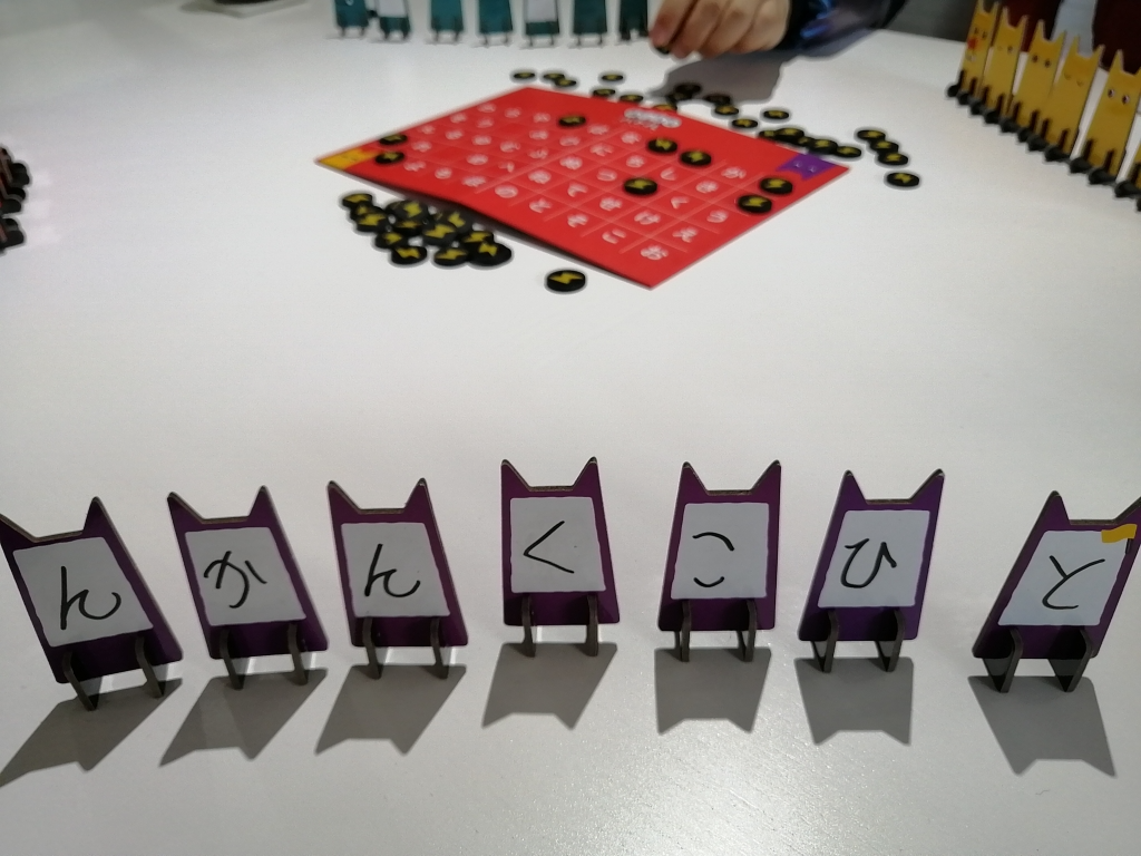 目的としては最後まで生き残ることで、手番では一文字を選んでチップを配置し、その文字を使用していたら他プレイヤーに公開することになり、公開した文字が一文字でも何文字目が公開されたかで予想されてしまいます。