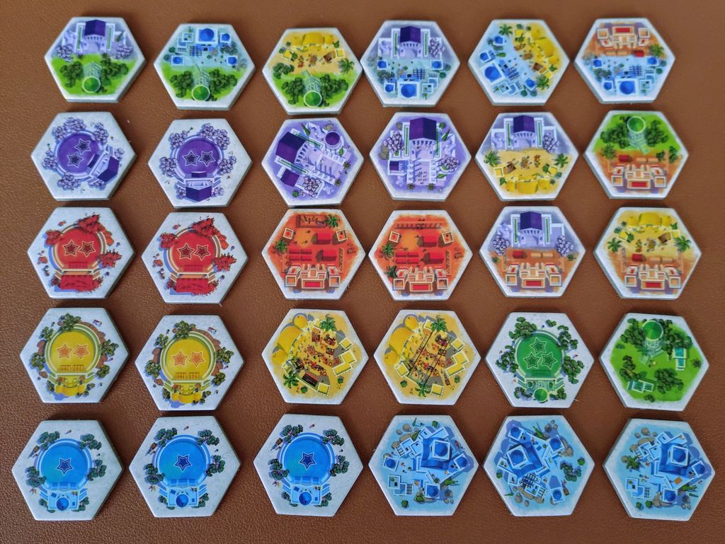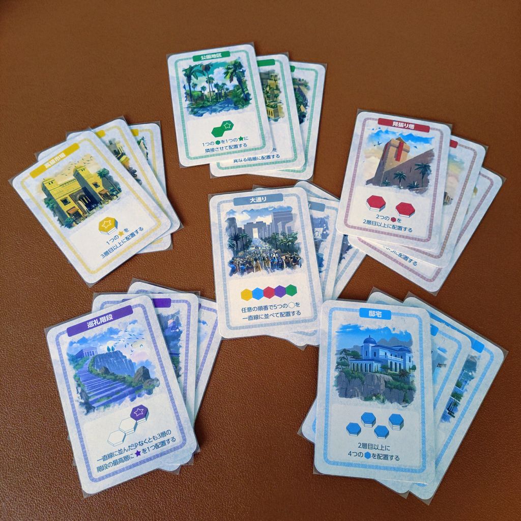 特に良かったのは、配置するタイルに高さの指定があることです。『アクロポリス』の大きな特徴は、タイルを3段まで積み重ねられることです。得点アップにつながりますが、タイルを積みあげることはむつかしい上、効果も把握しづらく、着手に踏み切れないことも多かったのです。“建設カード”が、タイルを積む動機づけとなりました。