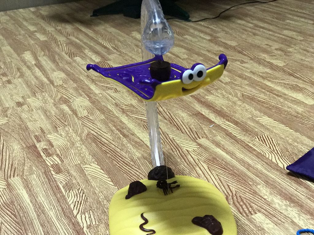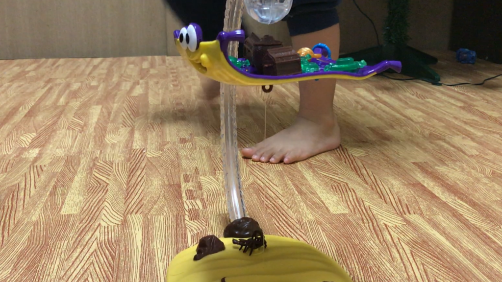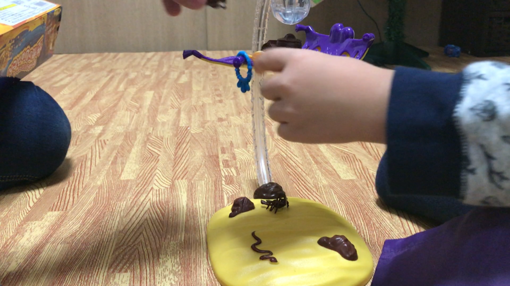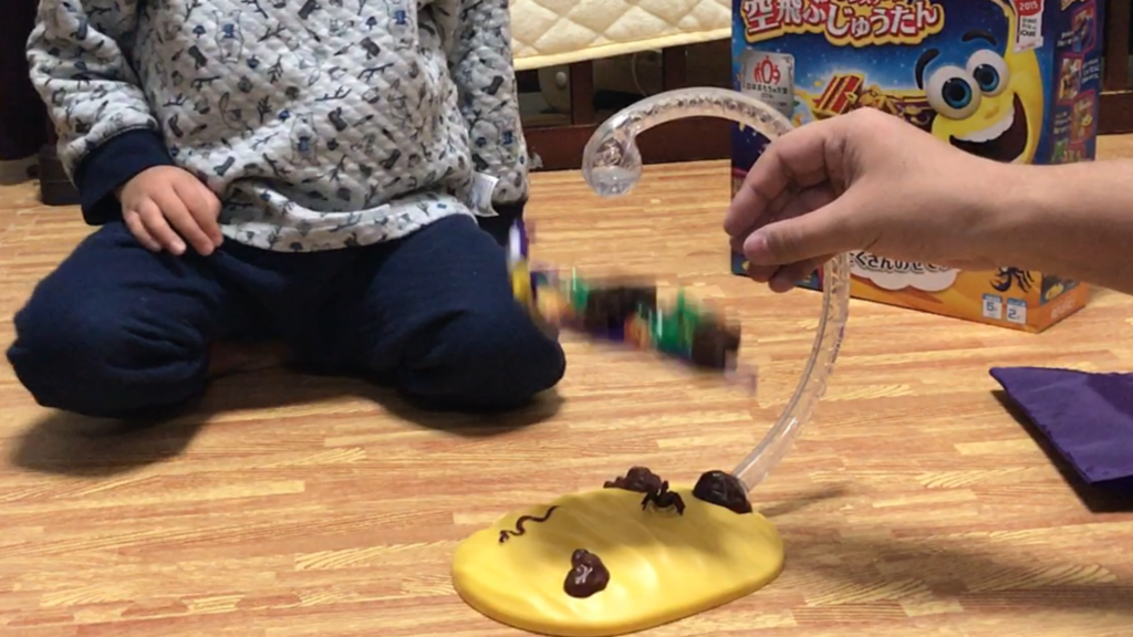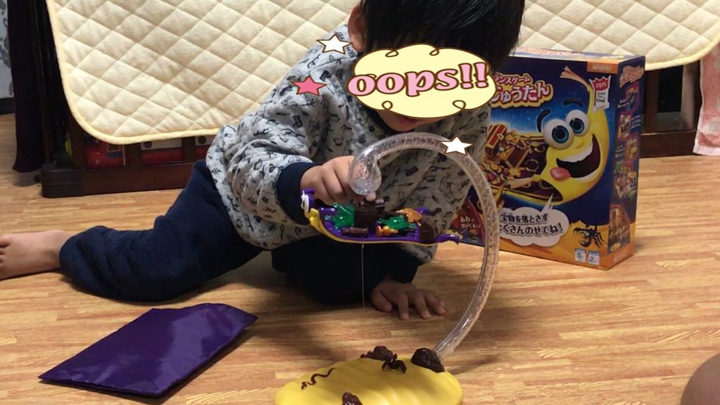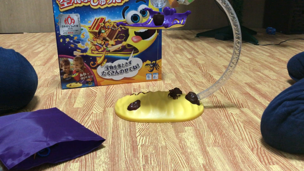 大人になっても、黒ヒゲ危機一髪で黒ヒゲがビョーンと飛び出て来るの、身構えててもちょっとビクってしますよね。あれに似てる感じです。じゅうたんを落下させた人がお片付けしましょうというルールです。